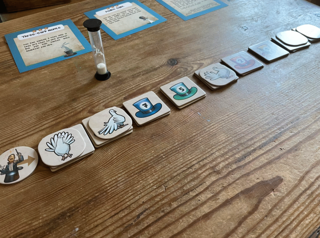 Players cannot communicate, so must watch what each other do closely to ensure that, hopefully, when the supplied timer runs out of sand, all the rabbits are in their correct hats and all the hats in their correct positions. The doves don’t matter, they can be anywhere at this point.