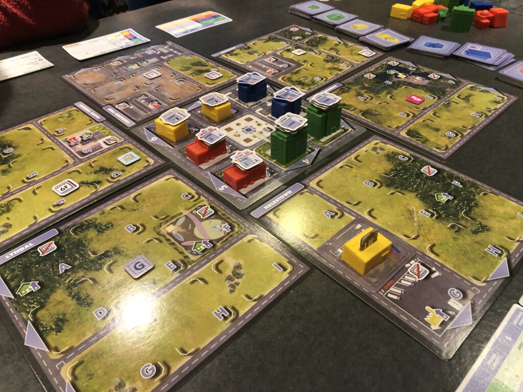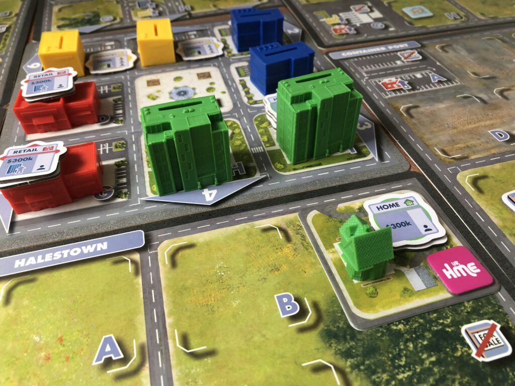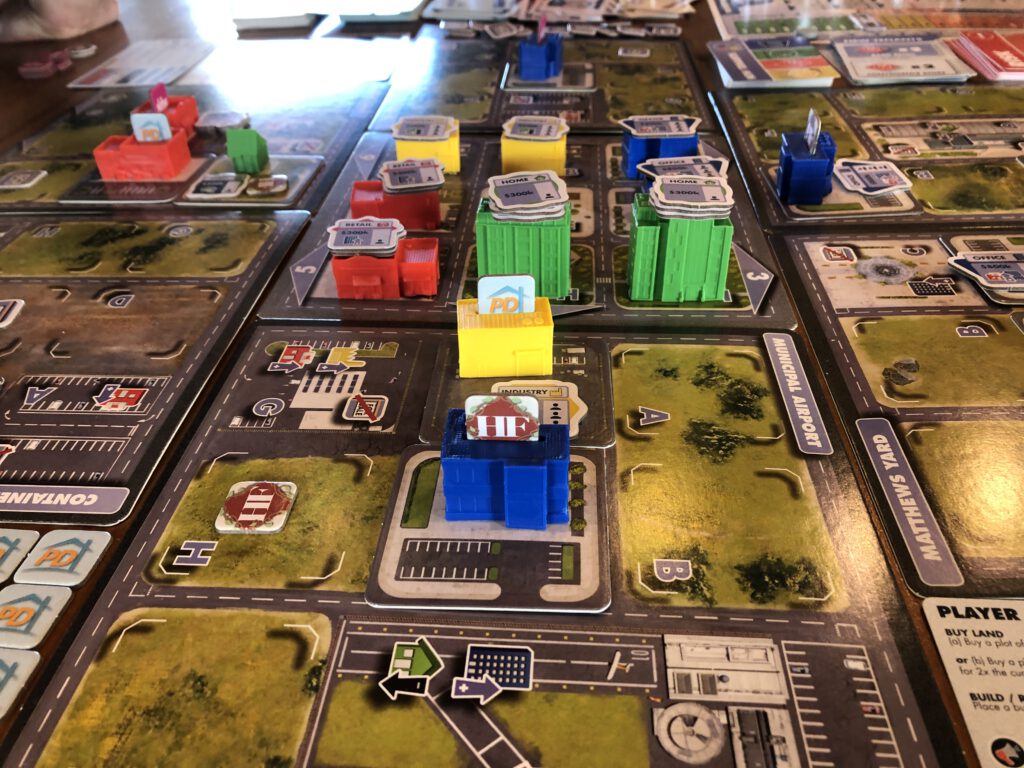 The city begins with a board at its centre already occupied by two each of the games’ four types of buildings: residential, retail, offices and industry. Around that extra boards are laid, with each board representing a neighbourhood and each neighbourhood broken into nine plots of land: each round, some plots become available to buy – players start with some cash in their wallet – and, subsequently, build on. Your goal is make money first by renting buildings, and latterly selling them, but before you can rent a building you have to build it, and to build it you need land!