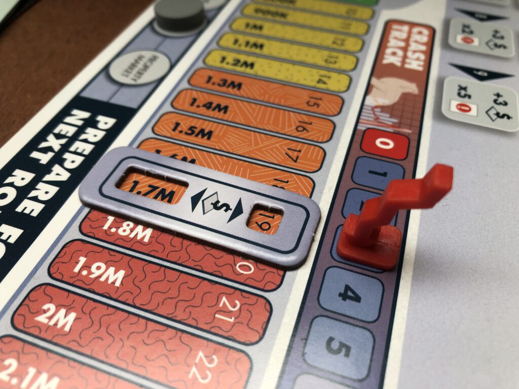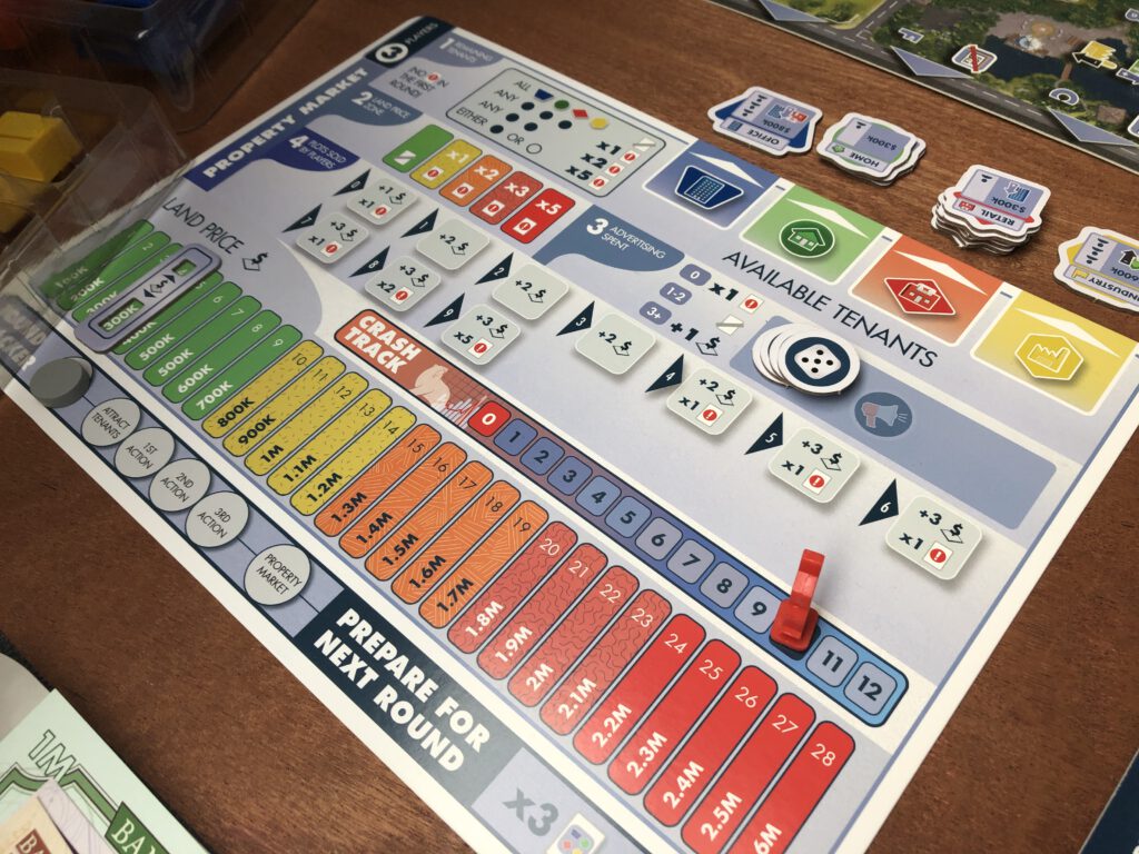At the end of each round, the players adjust the property market, which will change according to a number of things: how many potential tenants are still available, how many advertising tokens the players spent, and whether players sold any properties. These aspects may drive the land price up, and the crash marker down: and these two markers are the explosive hub around which each round of Magnate swings as one rises and another drops: when the two markers meet, the game will end. Before that happens, you’ll have hopefully sold land at an enormous profit: calculating its value (land + building + tenants + potential bonuses for neighbouring buildings or features) and multiplying the current land price by your total for the cash reward. Selling after the crash – at game end – will get you a comparative pittance, as the land price will have plummeted to near-zero. There is a lot of tactical play in Magnate – which is why there is a bid for turn order – but gauging the best moment to sell is really the dark heart of the game.