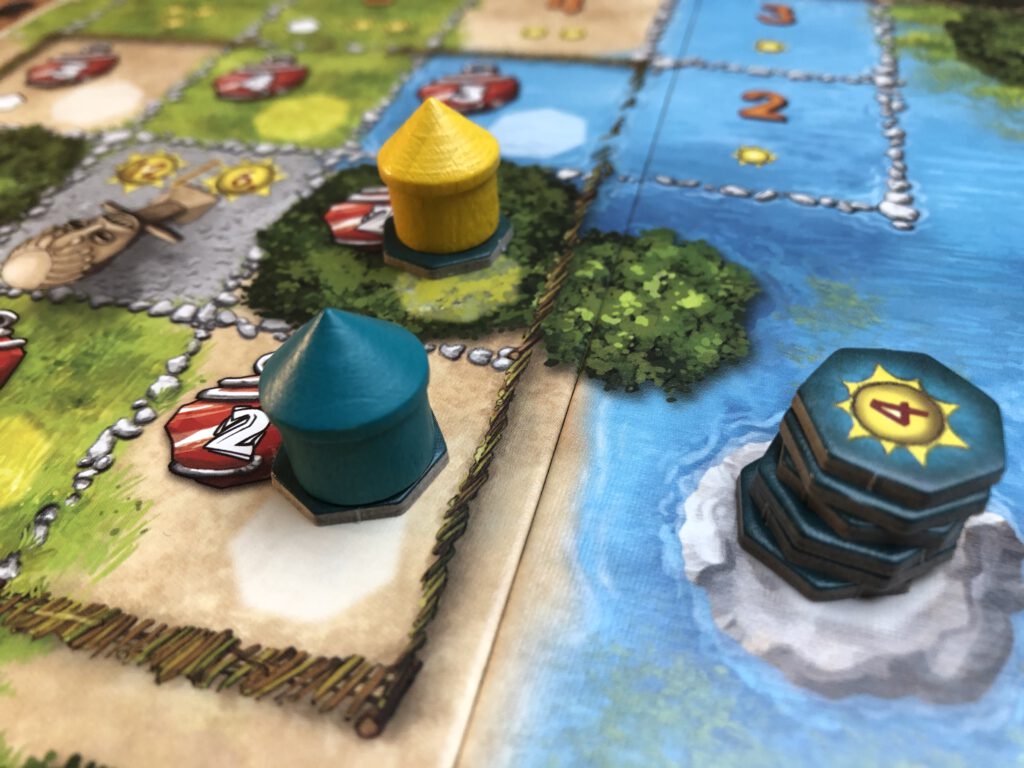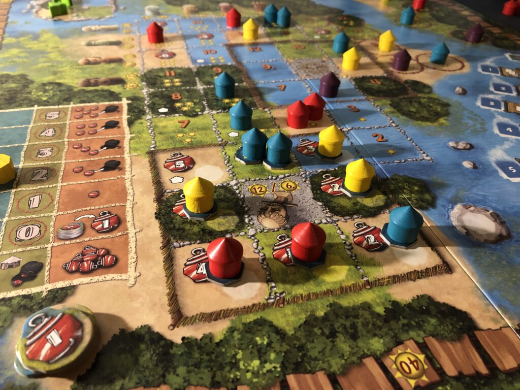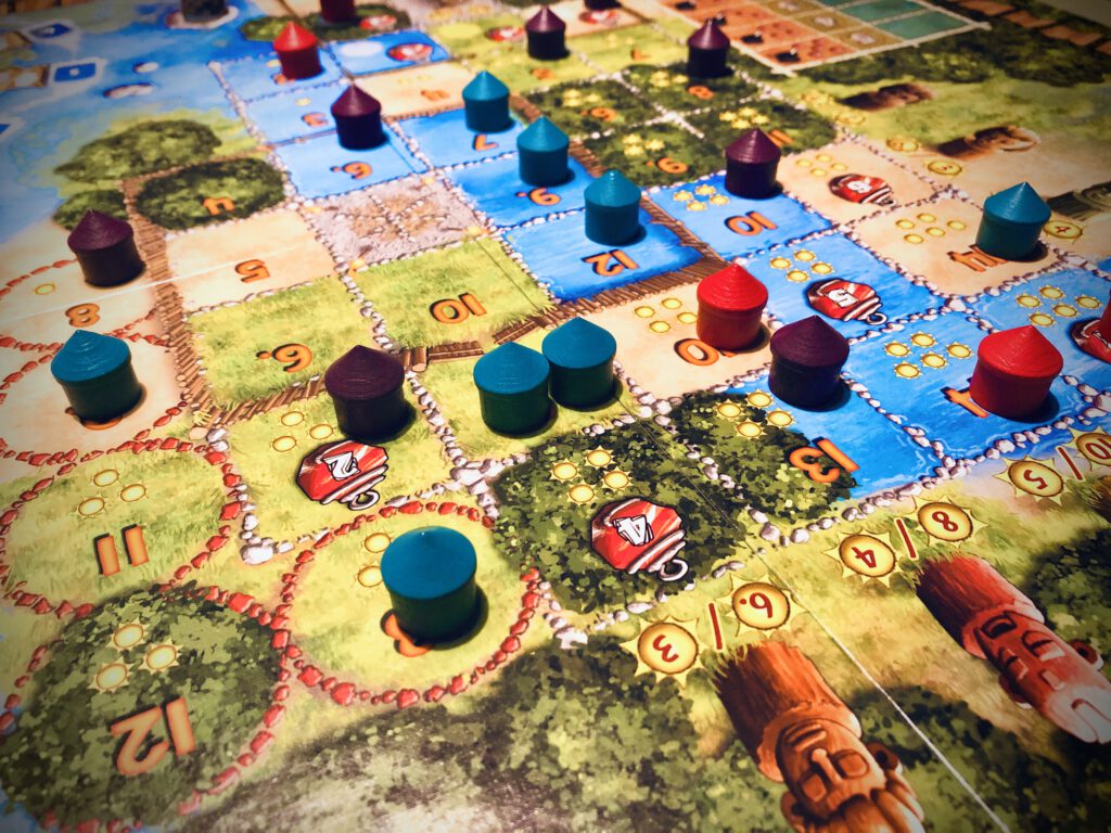 The amulets have two potential uses. They can be simply cashed in for points at the end of the game, or they can be cashed in to build huts on a particularly juicy spot on the board. And you can escalate how many amulets you pick up by building huts in specific spots that push you up an amulet track: the further you go up the track, the more amulets you’ll potentially collect.