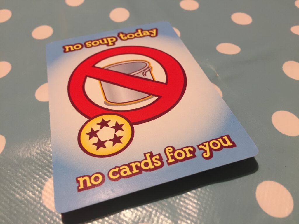 Everyone is given five Recipe cards: Onion soup, Pea soup, Mushroom Soup, Chilli Soup, and No Soup Today. At the start of each round, Ingredient cards are dealt that match the recipes: onions, peas and so on. Each suit has number values between 0 to 5, one 10 card and one Boil Over card. More on these momentarily. Having looked at your ingredient cards, you secretly choose which recipe you’re going to try and make this round. If you have a lot of onion cards, for instance, you might want to go for onion soup. All players reveal their chosen recipes, and play begins.