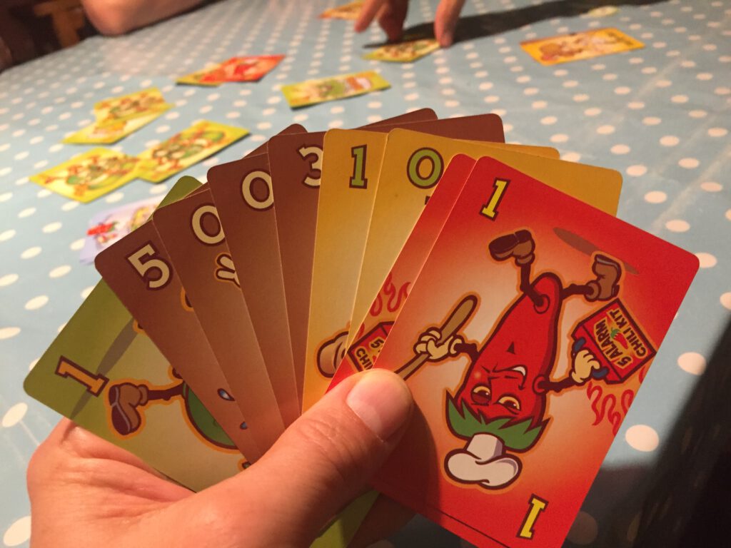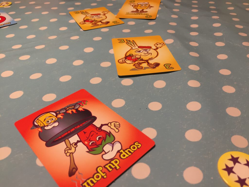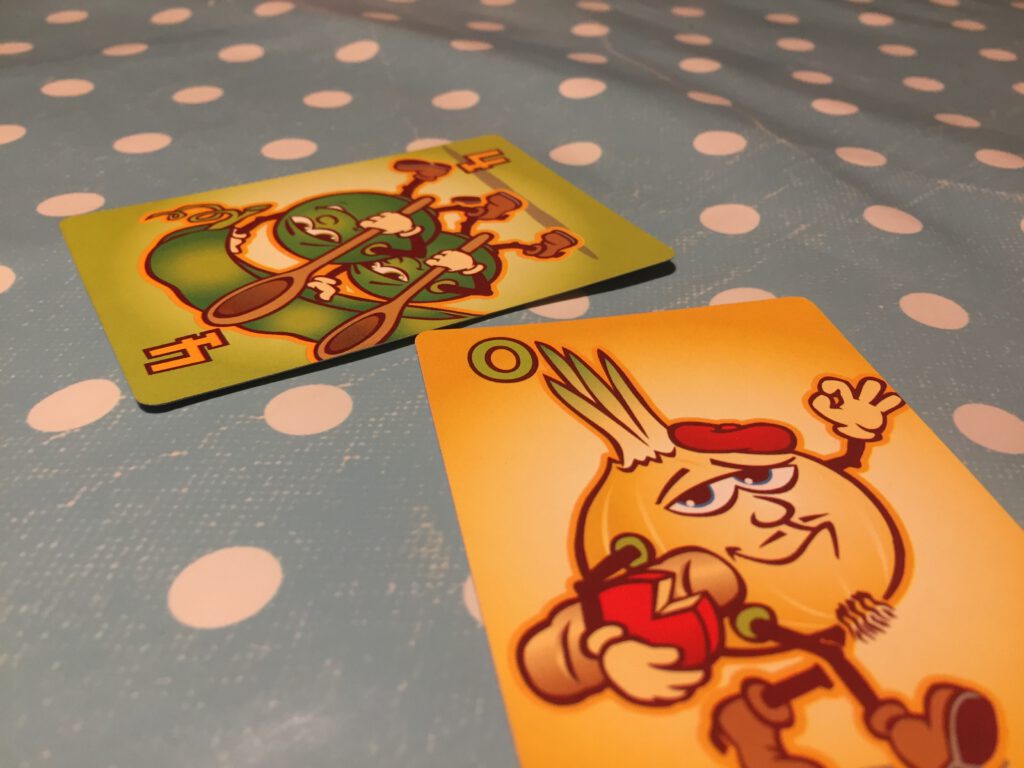 As with most trick-taking games, following suit applies: if someone starts a trick by leading a Pea card, you must play a pea card too if you have one. If you don’t, you can play any card you like. The number value of the trick is the combined numbers of the cards added up, and if you play the card that takes this number to 10 or over, you win the trick and take the cards. If you’re collecting onions and there’s onions in the trick: that’s points! Non-onion cards like mushroom and peas mean nothing. Chilli cards, however are minus points… unless of course you are making chilli soup, in which case the Boullion cards (the zeroes in each suit) are minus points. If you’re cooking ‘no soup’ then as you probably guessed, you don’t want to win any tricks at all.