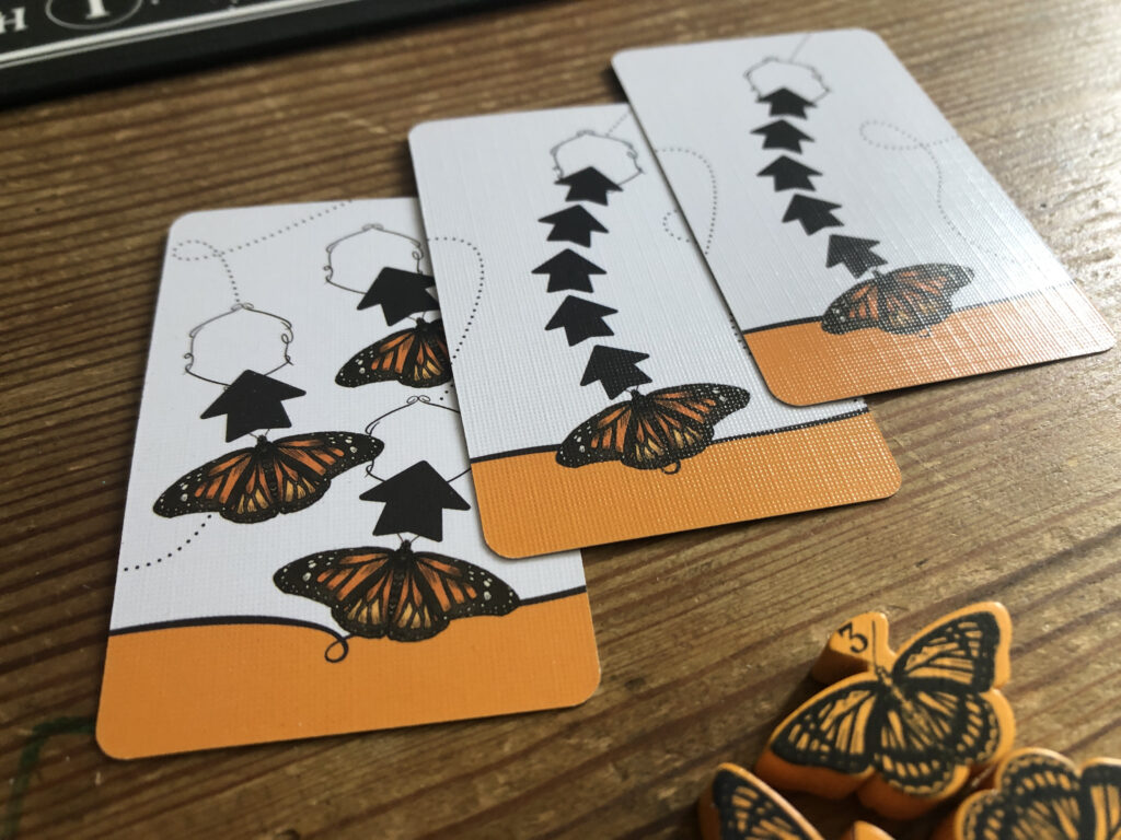 Over the three seasons of spring, summer and fall, players take turns moving their butterflies by playing Movement cards. At the end of each season, the current generation of butterflies dies out, so each have a limited lifespan on the board. In terms of realising the ‘finish line’ of Michoacan with your fourth generation butterflies, the passage of play is simple: collect flowers (by landing on them) and cash in matching sets (or larger random sets) to birth a next-generation butterfly. You also get to add a butterfly for free at the end of spring and summer.