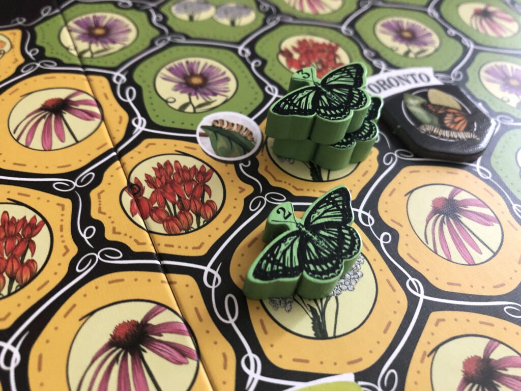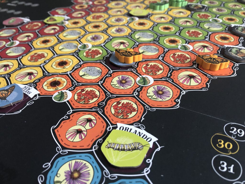 The board shows North America, broken into hexes with each hex occupied by either a flower or a Waystation token (in the city hexes) that will be revealed by the first player to reach them. Players begin with a single butterfly in the south, at Michoacan, and in terms of the game’s narrative, fly north in migration, gathering flower tokens which they cash in for more butterflies as they go, before (one hopes) flying south again and hoping to reach Mexico again before the game ends: butterflies at Michoacan will score points. But there are other ways to score, as we shall see…