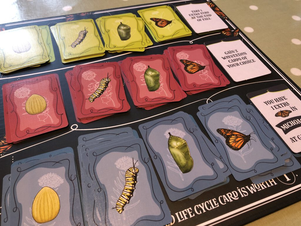 The more generation 4 butterflies you get back to Michoacan, the exponentially bigger your score. But each season also rewards points in different (randomized) ways to do with the number and location of your butterflies when the season concludes. The waystations also lead to points: landing a butterfly here lets you pick up Life cycle cards showing the four stages of the butterfly (note: some waystations reward you with bonus movements instead) which come in three colours. Every lifecycle card worth a point (a potential 12 points in all) but collecting a set (all 4 of a colour) also triggers in-game or end-game benefits, such as an extra turn at the end of a game, or points for having all types of flower token.