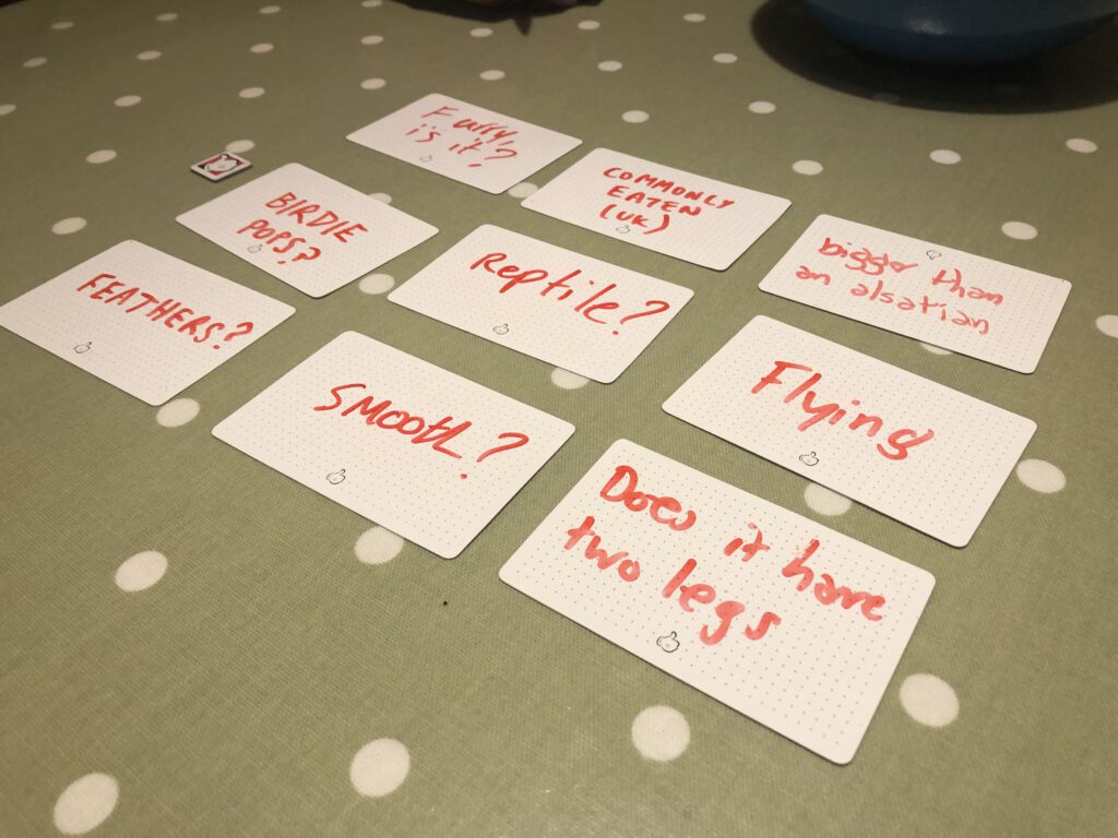 A single round then can simply add to the sense of puzzlement. But as the seekers progress through further rounds, they’re able to cross-reference earlier clues and – hopefully – get a firmer idea of what the answer is. If they’re confident enough, they also have some (dark-bordered) Answer cards with which to try and win the game (if you guess the answer on a non-answer card you lose!)