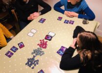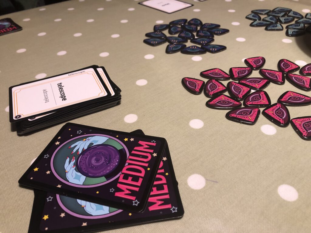 The mediumship is really less mind-reading and more connection/perception: everyone has a hand of Word cards with a single word on them, and teams take turns playing a card each and then finding – or trying to find – a word that connects with both of them. If you’re to my left and you play the word Summer, I might play the word Zoo. After a bit of thinking time – how long really depends on the patience of the other players – we both count down three, two, one… and say our connecting words: I say Safari, hoping you will too… if you do, we score points! If you don’t, we get a second turn, now looking for the connecting word for our guesses instead: I said Safari, you said Ice Cream – what were you thinking? – so now we count down three, two, one…. and say a new word each, hoping to say the same word and claim some (lesser) points. If that fails, we get one more chance to connect the latest guesses (the rewards for a third guess are even more paltry, however!) before we draw new cards and play moves on. It’s often the case that players don’t connect, although it’s interesting to see how people make different associative connections.