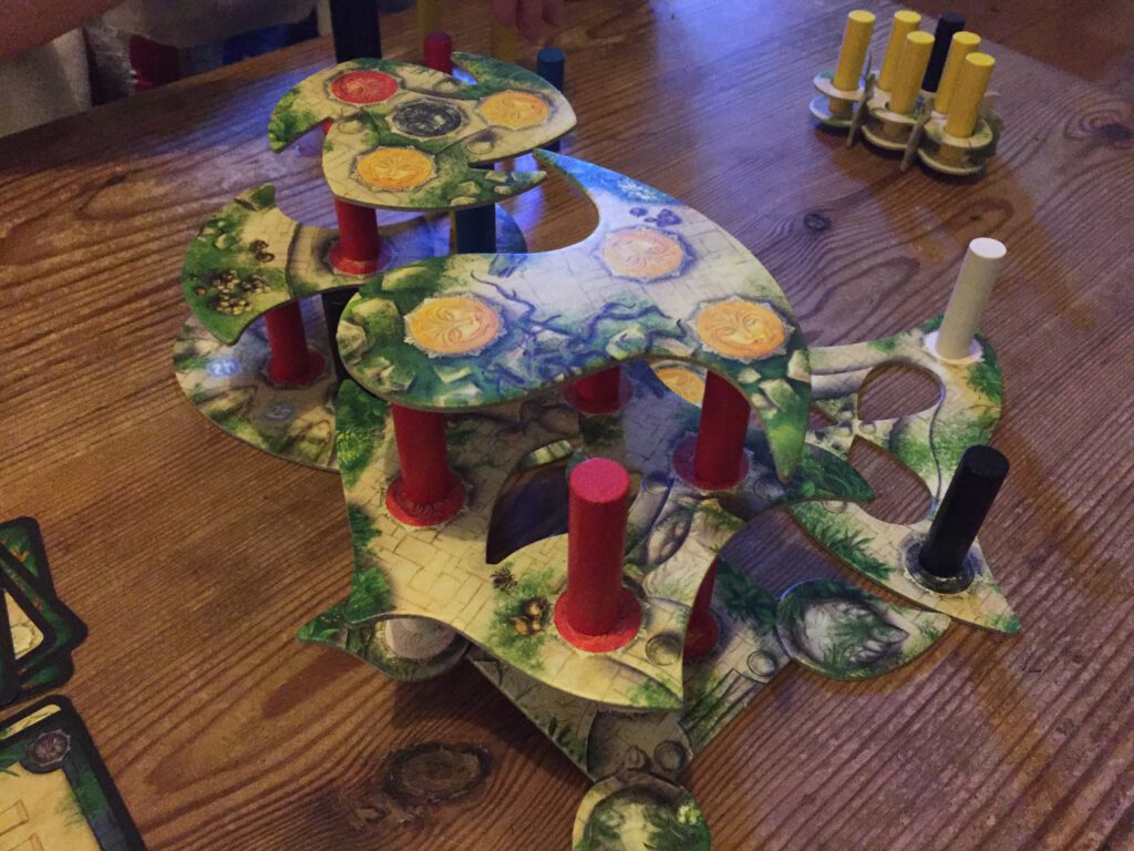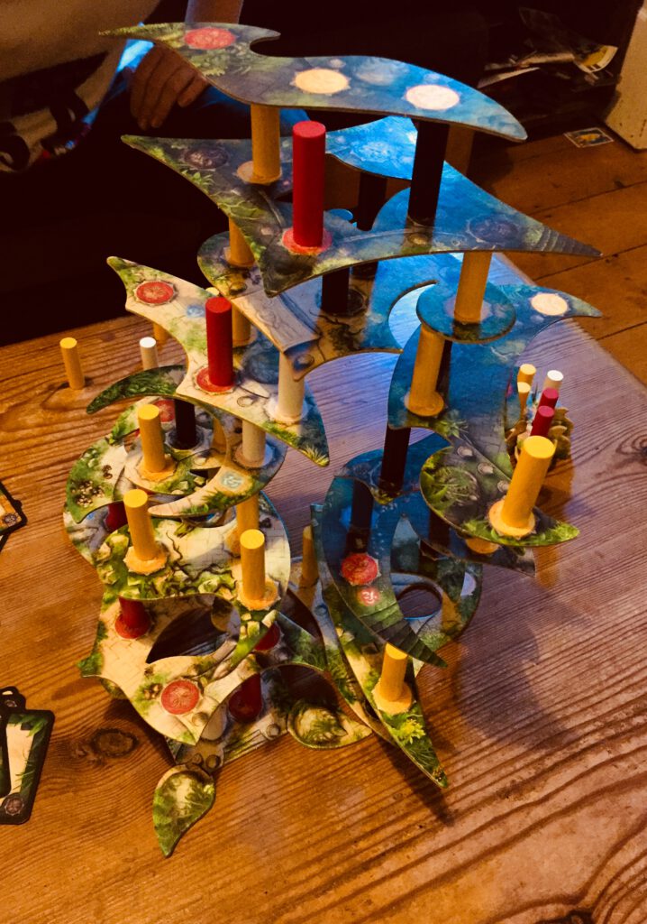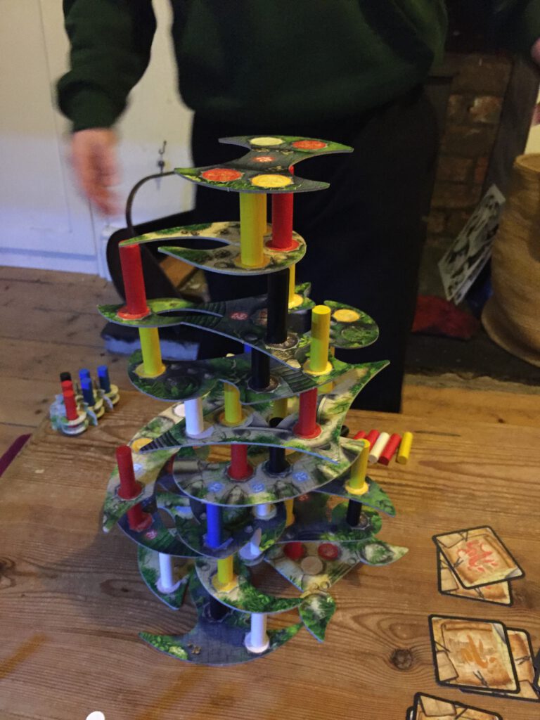 Menara’s rulebook comes with a story of discoveries and cursed temples but really, this is an abstract dexterity game with no theme. But as dexterity games go, it’s an excellent one: a quest where the threat of more levels is as present as the threat of collapse. I really enjoy this one and we find ourselves playing it again and again.