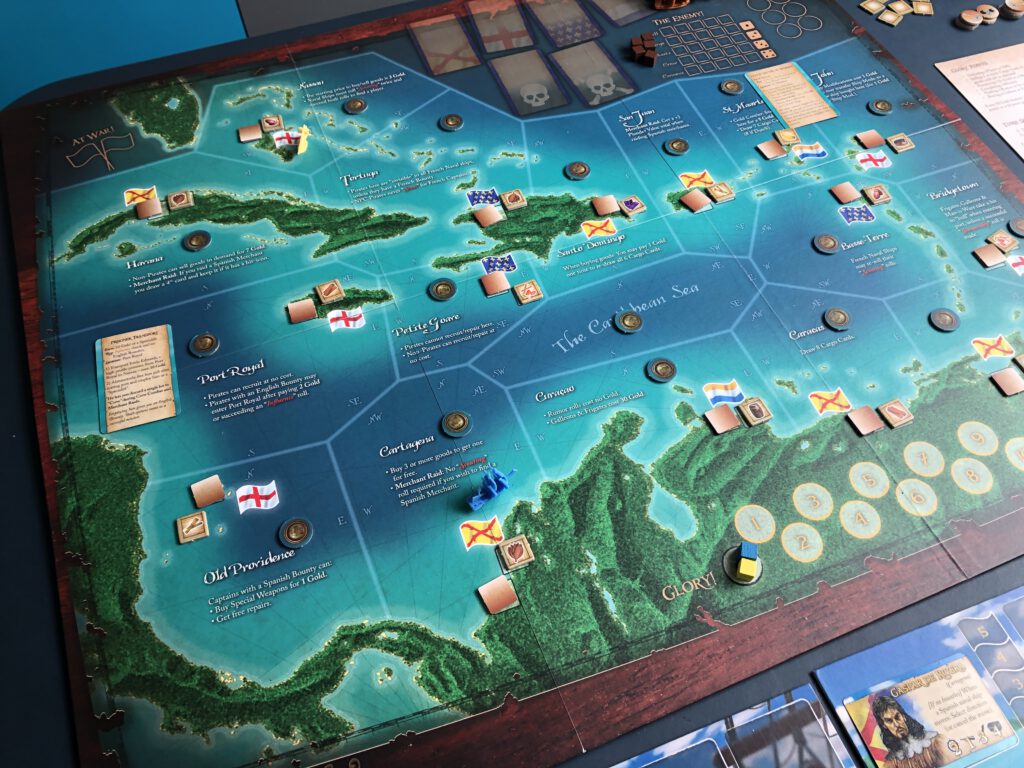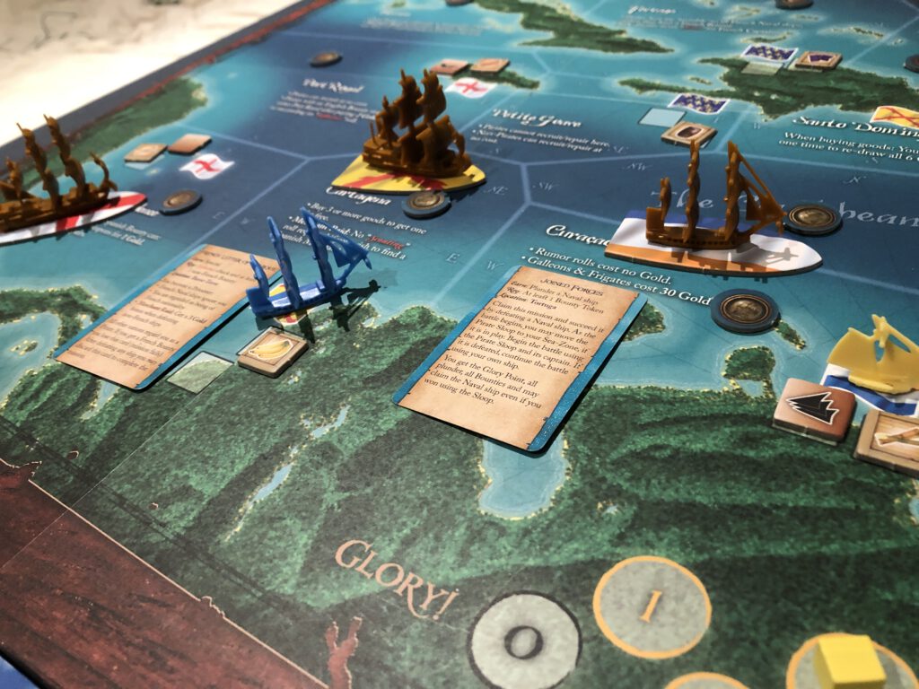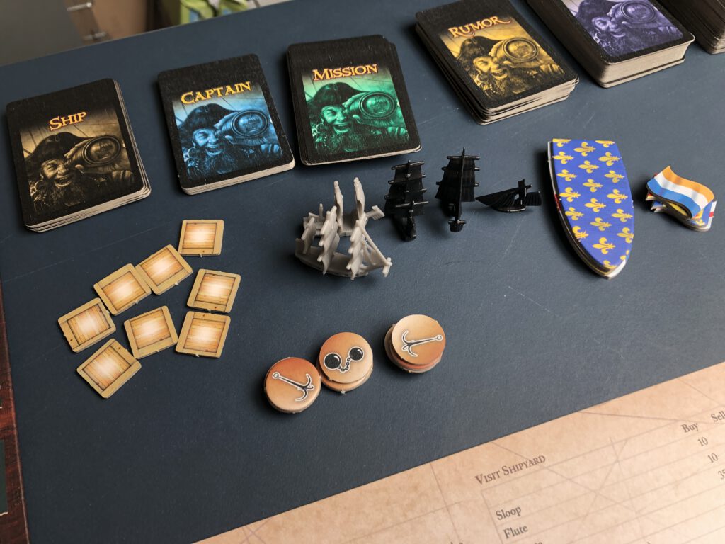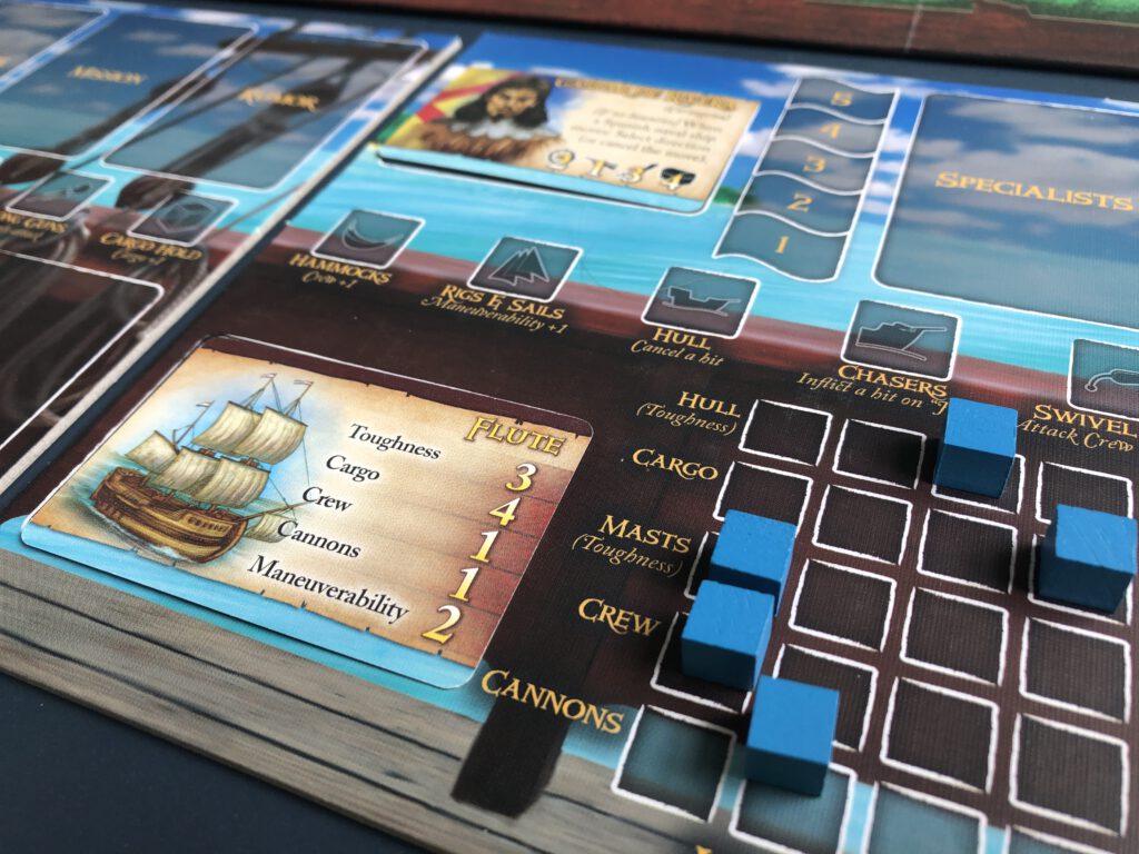 Set on the high seas of the Caribbean in the distant past, each player begins the game with a captain (of a certain nationality) and a boat (sloop or frigate) with each aspect having certain strengths and weaknesses: leadership, seamanship; strength of hull, manoeuverability and so on.