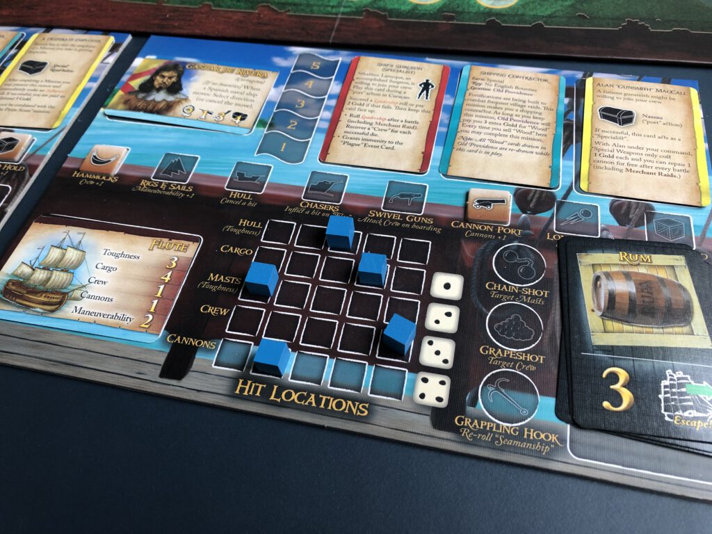 You begin with ten gold at your disposal and with your ship in your home port. On your turn you take three actions: you can move (in or out of port, or from one sea space to another) scout for ships (assuming you mean to raid them!) or take a port action when docked at the numerous destinations on the board. When at port there are a number of things you can do, all considered to be part of the same single action: sell goods, buy goods, improve/repair your ship, recruit crew, seek rumors and missions. The busyness of those port actions contrast with the simplicity elsewhere, but – as with scouting – the success of some of these actions depend on the dice-rolling abilities of you and your captain: leadership, seamanship, scouting and influence are all put to the test: your captain denotes how many dice you get to roll, and a skull symbol means you succeeded.
