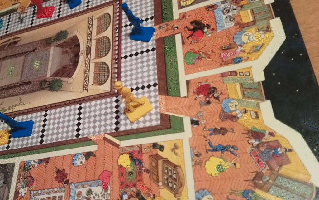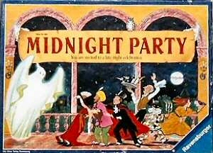 Midnight Party (also published as Hugo and more recently Escape from the Hidden Castle) is a great family game for all ages. The theme of the game is – appropriately enough – a party, which takes place in a haunted mansion (the board) where the players have two guests each, walking sedately around the halls enjoying events – until midnight strikes, and Hugo the Ghost arrives!