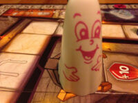 The board is set in the middle of the table with Hugo the ghost placed in the cellar, and each player chooses starting spaces for their guests. On your turn you roll a die, which allows you to move one of your guests around the track (i.e. the hallway). However the die is missing a 3 and and a 6 side – instead you have an image of Hugo the ghost. If a Hugo is rolled, he makes his way up from the cellar – and only when he reaches the hallway are the guests allowed to duck into the rooms and hide from him. Only one guest per room!