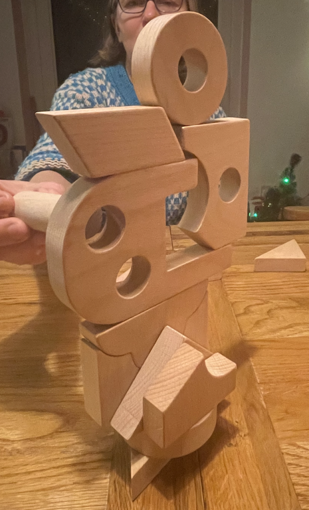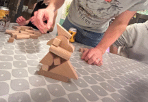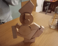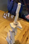 The game is made up of 40 wooden pieces, and before play begins players randomly grab 10 each to form their supply (- there’s a maximum of three of the tiny cubes per player: one player grabbing them all would have a huge advantage). Play begins with someone placing one of their pieces centrally, starting a shared stack, and thereafter players take turns adding one of their own pieces anywhere on the stack as long as it doesn’t touch the table. The goal is to be first to place all of your pieces to win – but if any of them fall off during your turn, they go into your supply.