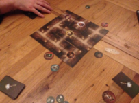 The board is made up of nine city tiles that are set up randomly, with the character side facing up. Three detective pieces – Sherlock Holmes, Dr Watson and his dog Toby – are placed around the outside of this playing area. Because the playing area is made up of parts of a city, the detective pieces can effectively look down any street they are adjacent to at the end of a turn. On a turn four action tokens are thrown in the air, and whichever side up they land decides which actions are available for that turn. The action tokens move detectives, rotate city tiles, swap city tiles or allow a player to take a character card – this latter option allows the detectives to eliminate people from their enquiries (as Mr Jack’s card will already have been removed from this deck) or allow Mr Jack to collect hourglasses, which are marked on the cards.