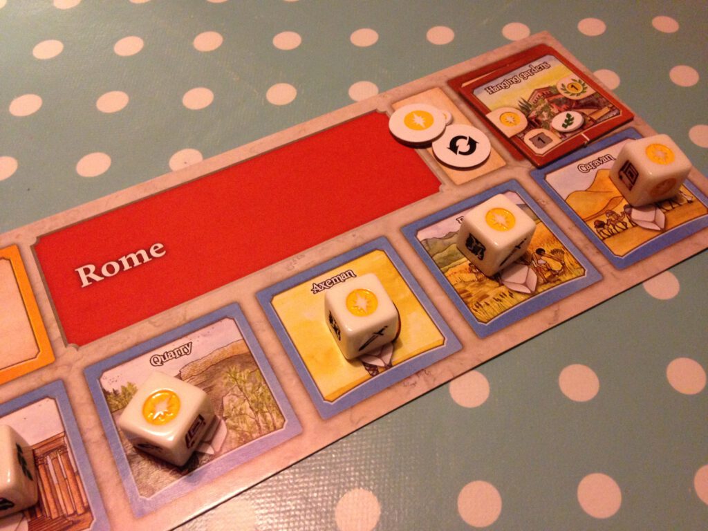 Each player is given a player board that has an empire from history (Rome, Persia, etc) on it. Apart from the name the boards are identical. Players also begin with five white dice. A communal board goes in the middle of the table and tiles are dealt to this board which the players can ‘buy’. The game is played over three ages during which time players will roll their dice and then spend them in a variety of ways. The dice don’t have pips but instead the sides show a variety of aspects to your nation’s culture and development: food, books, military, money, and ore.