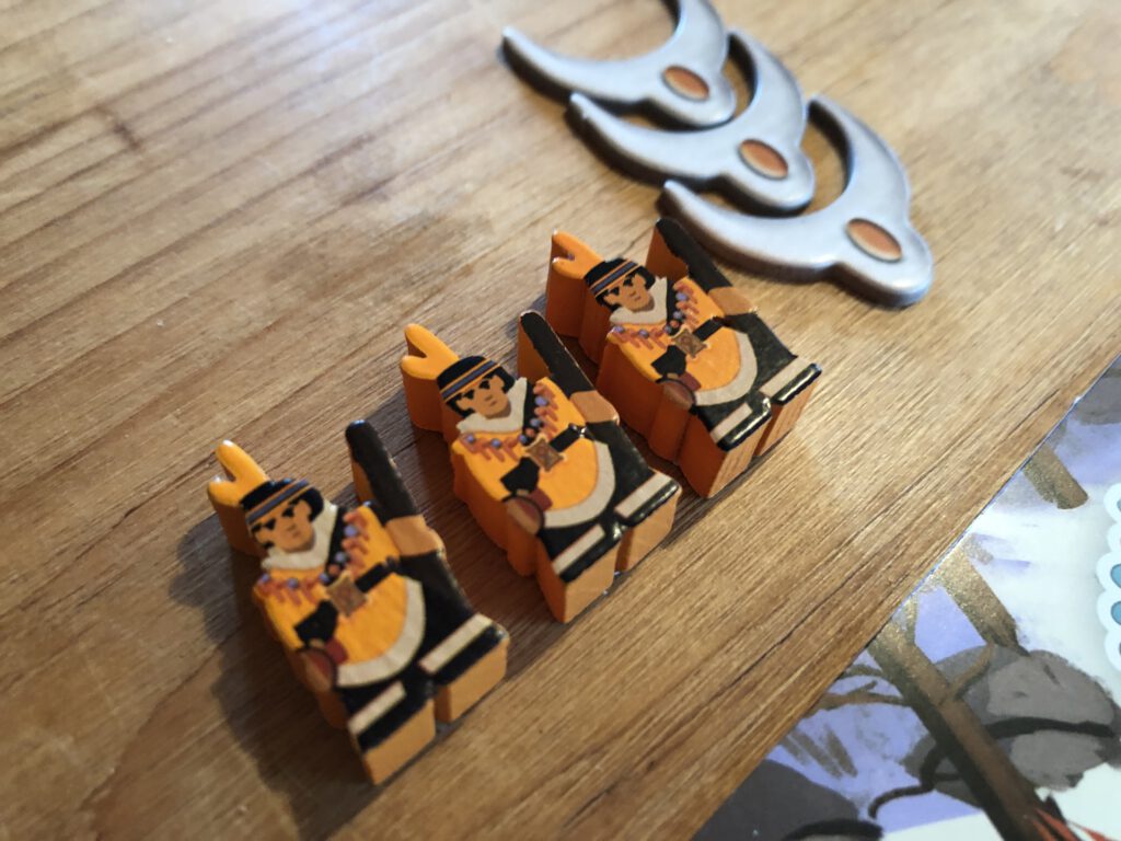 In Nētā-Tanka, players are competing tribespeople hoping to become the new venerated elder (the Nētā-Tanka of the title) by proving themselves as the best tribe leader. Every round, you will send your people out to complete tasks on the board, such as locating, hunting and cooking buffalo, foraging for mushrooms, cutting logs and so on.