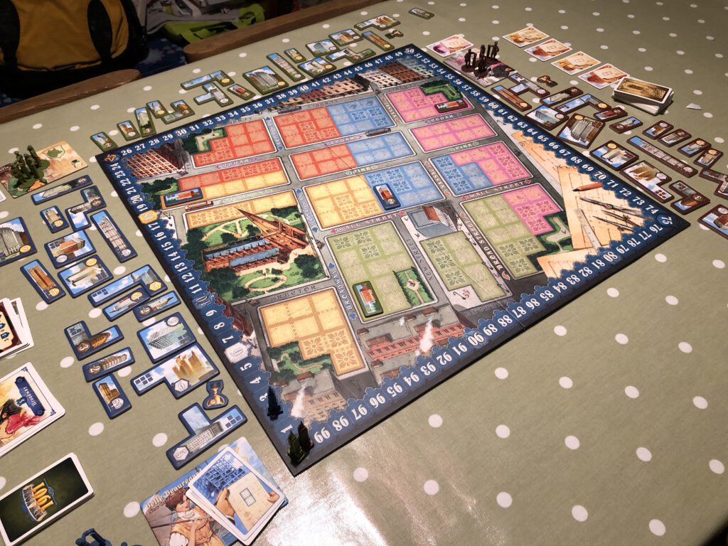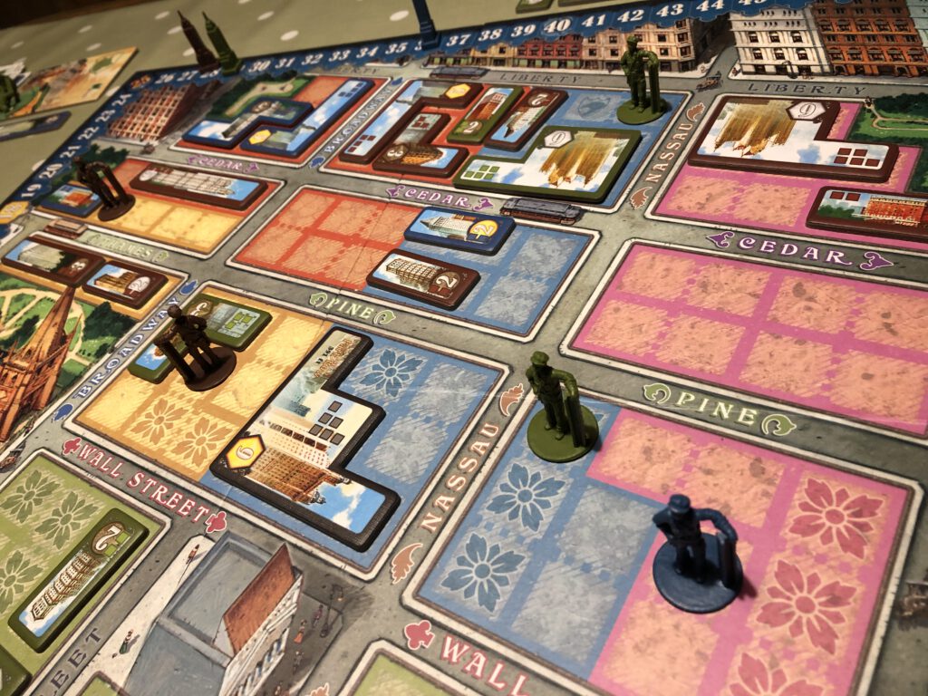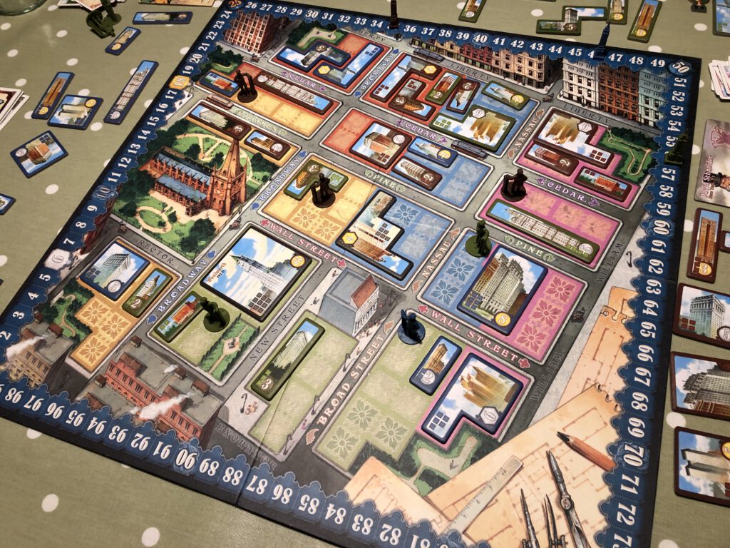 The board shows New York itself – or part of it – with the blocks on the map vacant and ready to be built upon. Everyone takes possession of four workers and their tetris-like skyscraper tiles, and places their starting skyscraper on the board. Four lot cards are flipped face-up and the game begins.
