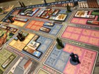 How New York 1901 plays is actually rather simple – on your turn, you acquire land by taking one of the face-up lot cards and place a worker in the matching colour – there are several on the board; some tiles are patterned and need a matching pattern on the lot card. Then you may (if you want to) build; removing a worker or workers from the board in order to place one of your tiles into the lots they had claimed. Crucially, you cannot overlap with any other lots, whether unclaimed or occupied by an opponent. Whenever you build, you score points! And as you move up the score track, initially only building the basic (copper) tiles, you’ll trigger the ability to score better tiles (silver) and best tiles (gold). So there is a decision to be made between some points now or more points later, as the more workers you have grouped together, the bigger and better skyscrapers you can build.