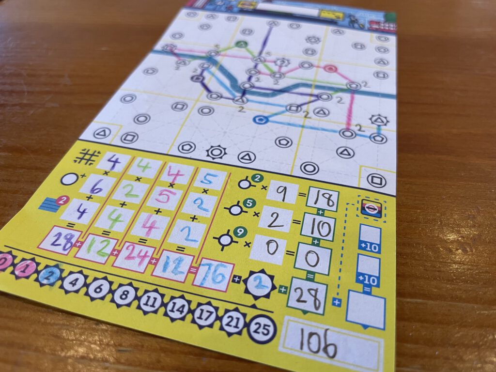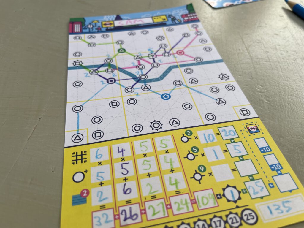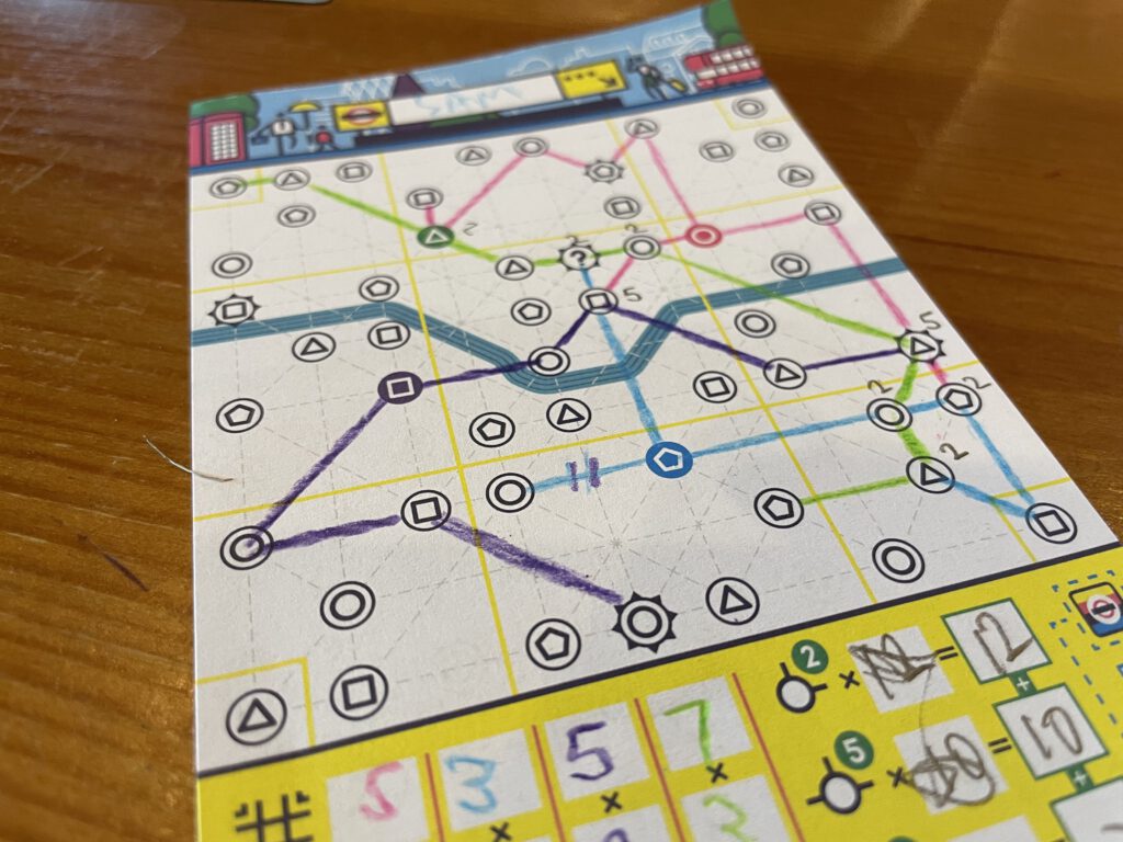 Roll-and-writes, flip-and-writes, whatever-and-writes have become fairly ubiquitous in the last few years and I must admit after finding them fun initially I’ve cooled slightly. The appeal to me with the simpler iterations was the agony of options running out and hearing the gasps of despair around the table, punctuated by an occasional shout of joy. I still like Avenue for this, but if Next Station: London doesn’t bump it from a list of favourites, it’s a good substitute. If it lacks the high drama of Avenue’s finale, it gives you more control over your destiny and a sense of strategic options: go big each round, or cramp the lines together to maximise those connections? While I generally prefer more interactive gaming experiences, it’s not entirely at the expense of canny little puzzles – and NSL is certainly one of those.