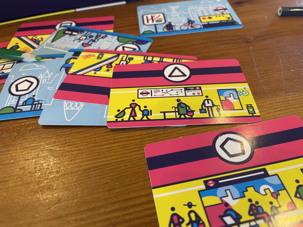 Everyone receives a map sheet (broken into 13 regions) and one of the game’s four coloured pencils: the colour of the pencil denotes which line you build first. The map has four starting spaces for the four lines, and a whole bunch of other potential stations, marked by several symbols: square, triangle, circle, and pentagon.