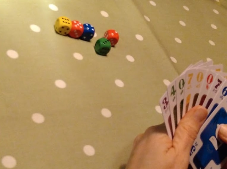The game then plays out as a standard trick-taker: one player leads, everyone else must follow suit if they can. If you can’t, you can play anything. Everyone can play either a card or one of their dice – with one critical exception. The last die you have left when the others have been played becomes your bid for how many tricks you’ll win! When all cards and non-bid dice have been played, everyone scores a point for each trick they won, plus a bonus if they hit their bid (you can also bid zero, but must do so before trick-taking starts). After three or four rounds (for three or four players) the player with the most points wins.