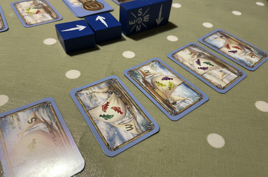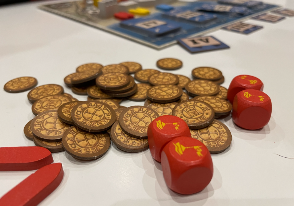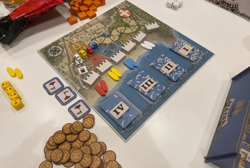 Each round in Noli has a boat race, which consists of all players rolling all their dice at the same time until they have each die with an oarsman symbol face-up. This part of the game is fairly frantic, but you can take some pressure off yourself by presetting dice to the symbol you need – this is the purpose of the oarsman bid in the auction. As players ‘finish’ the race, they’re encouraged to shout the family names of Noli’s player colours: Ciassa! Maina! Burgu! Portellu! The first to finish will take cards from the juicy I stack, second place from the II stack and so on down to the paltry IV cards, and how many cards you take is equal to how many boats you own – which is why bidding for extra boats can be very helpful! Everyone begins with two, but you can potentially have as many as four.