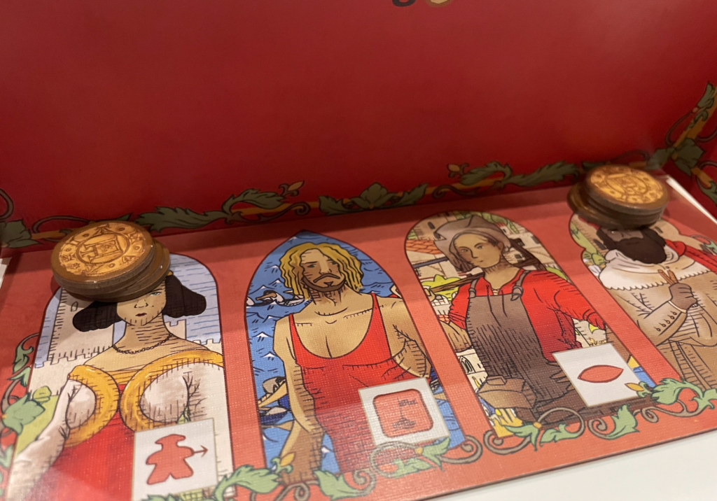 Everyone begins with some cash and in each round of the game we’ll all bid – secretly, behind our screens – on four different things, which are then revealed and resolved from left to right. The first is the right to push your piece up the influence track, which is a tie-breaker for both bidding (important!) and potentially, the winner of the game later if there’s more than one tallest-tower. Then we resolve the highest bid for oarsman and boats – relevant for the coming boat race, and to be explained below – before finally the highest bidder on towers gets to add another block to their tower. Then… after everyone loses the money they bid, the race begins!