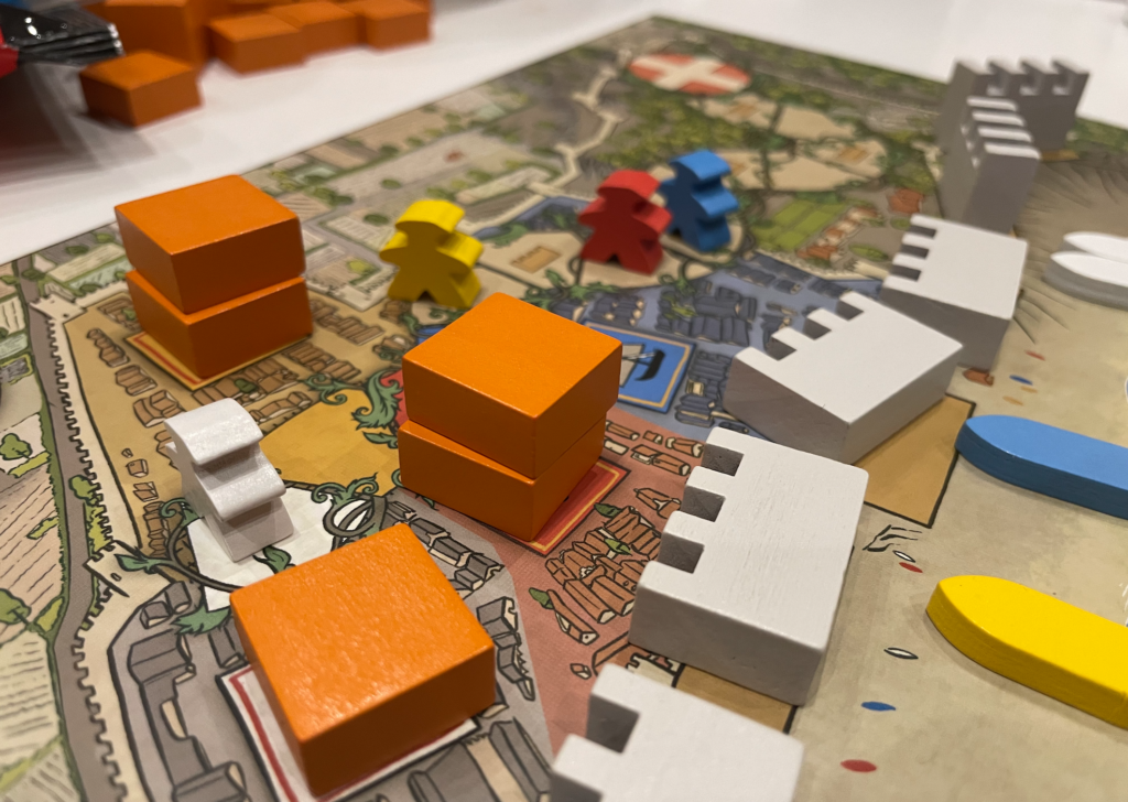 The cards are revealed and, most often, simply tell you how much money you’ll have in the next round. But sometimes they’ll allow you to sink an opponent’s boat, or tell you to destroy some of the city defences (see the walls in the pictures), representing attacking Saracens. However, if all the defences have been destroyed, then you remove a block from someone’s tower instead!