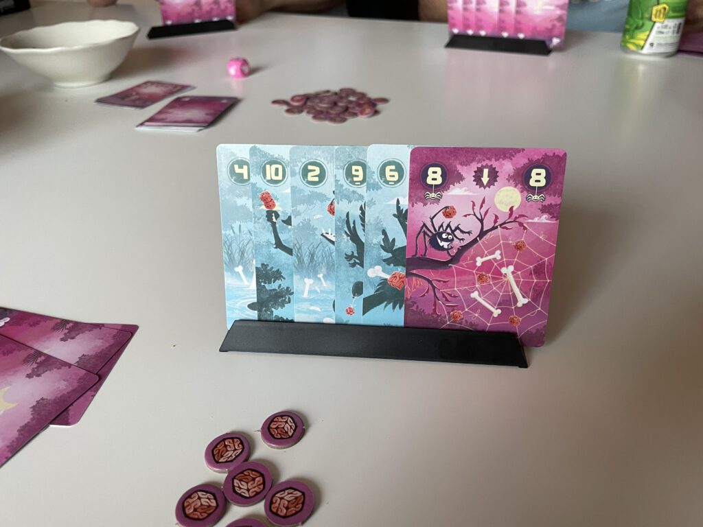 Whenever your hand goes below three cards, you replenish it from your cemetery. If there are no cards in your cemetery to replenish with, you’re making progress: getting rid of the last card wins you the round. If you can’t legally play – because your card numbers are all too low – you lose a brain and pick up two cards from the deck, adding one to your hand and one to your cemetery.