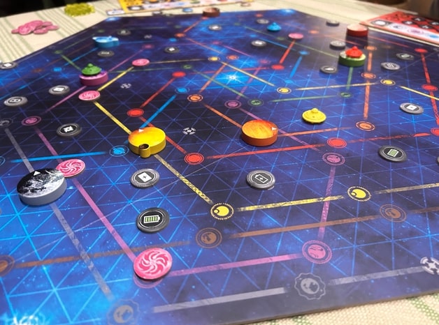 Dotted around the board are the space stations, which can be visited to aid your progress: getting more energy cubes or triggering long-distance movement through Hyper Jump Portals and Hyper Accelerator Cannons! Some space stations you can actually remove from the board if you’re first to arrive: they’ll improve your hand size or energy capacity. Once you’ve visited all the planets, it’s a race to return home before anyone else does.