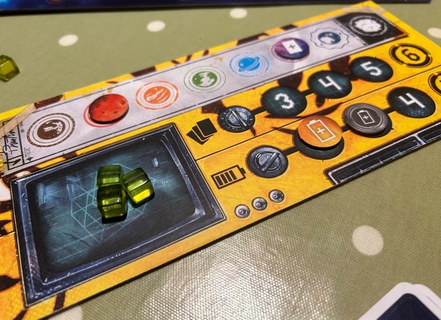 Each player starts with their spaceship on their own planet with a hand of three movement cards and a ‘dashboard’ in front of you that tracks three things: number of cards and energy cubes you’re allowed, and the number of energy cubes you currently have (none at the start!). It also tracks which planets you’ve visited.
