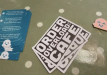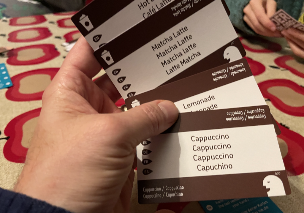 The box contains seven level markers which are laid out in ascending order where everyone can see them. Everyone is dealt a salesperson chip – placed happy-side up, for now – and then the game begins. The starting player reads out a number of Order cards (number of players x the current level) and then deals them out to all the players. Ideally, at this point, everyone can remember all the orders – and on Level 1 that is probably true. But inevitably, the cafe is going to get busier…