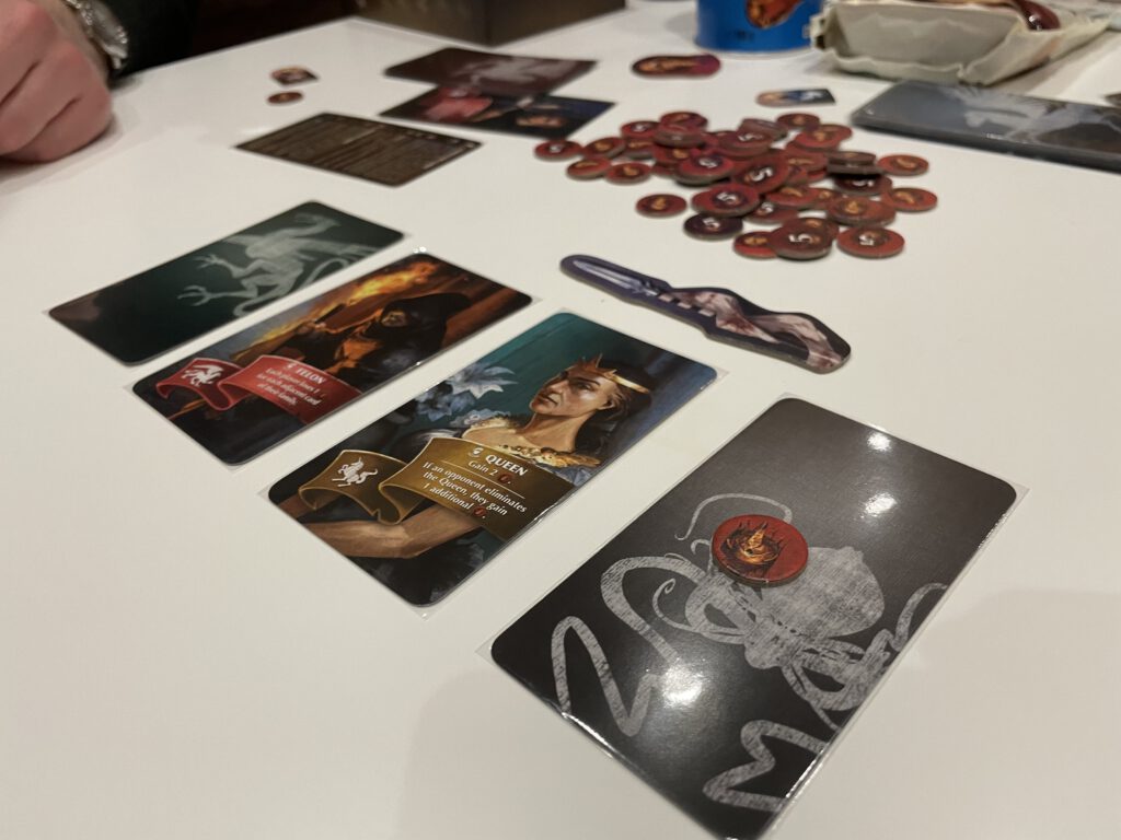 Players are each given an (identical) deck of cards, but before play starts everyone shuffles and loses three cards randomly: you might be without your Queen, whereas other players lose their Cut-throat and Trap cards. Play takes place over six rounds, and in each round you’ll play one card – meaning you’ll have just one card unplayed when the game ends. The rounds proceed with everyone playing a single card face-down into a row, adding at either end of the row, before the card row is resolved: going from right to left. Each card owner can choose whether to reveal their card or not: if you don’t, it accrues a point that can be collected when you do reveal it in a subsequent round. If you do reveal it, the card activates: and the activations are really what Oriflamme is all about.