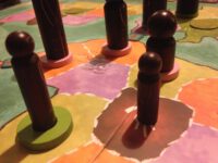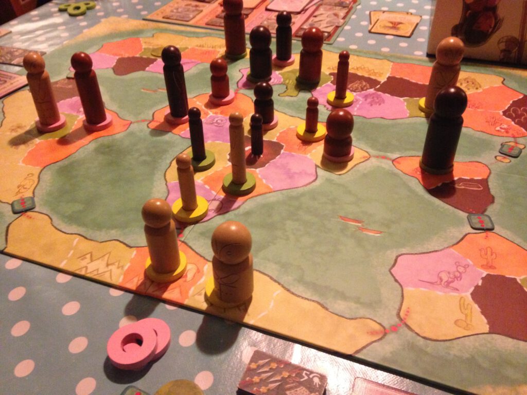 The board shows a simple map of six continents broken into different coloured regions of purple, green, orange and brown. The game begins with a single, un-owned tribe at the centre of Africa. Players are given three purple goal cards and choose one to keep, then you’re off.
