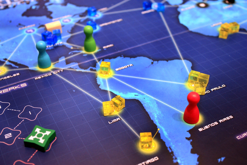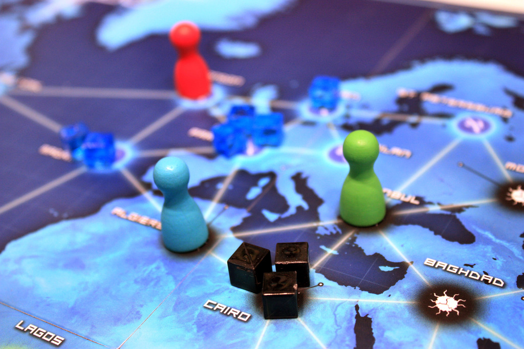 The board is a map of the world, which is being ravaged by four fast-spreading diseases (represented by different coloured cubes). The players are scientists trying to control the rampage of disease, whilst simultaneously attempting to find cures. If they can manage to find all four cures the players win. If a certain number of outbreaks occur, or the player deck runs out, or if all cubes of any one disease are on the board – the players lose. Along with the entire human population of Earth.