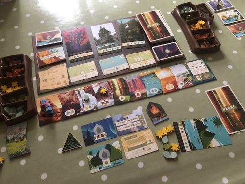 However, some spots on the path give different options: one allows you to take another canteen card or a photo (photos cost resources and are worth 1 point), another gives you a ‘wild’ resource, another lets you convert resources into other resources and so on. When your hikers reach the end of the trail then you have choices: you can reserve a park card so nobody else can buy it, buy Gear cards that give you in-game advantages (each has a simple explanation on it), or buy a park card as previously mentioned, spending your harvested resources. When there’s a single hiker left on the path, they sadly don’t get to take any more actions but are instantly catapulted to the end!
