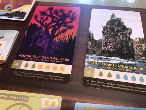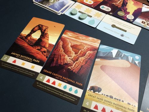 The tokens all represent aspects of things you’d encounter hiking through the parks – mountains, water, sun, trees. Generally you simply hang onto them until you have enough to buy one of the Park cards, which are broadly speaking the goal of the game: they’re worth points. But everyone also has a water canister, which if you ‘fill’ with water you’ve collected will give you something else in return: a mountain, for instance.