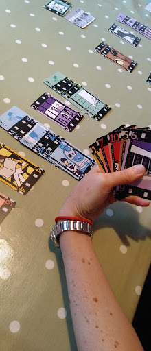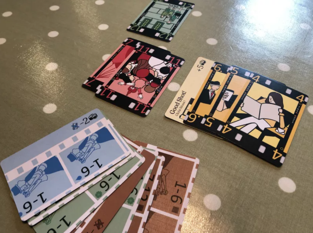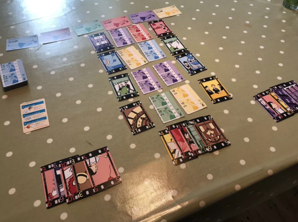 Nestling somewhere near the bottom of the deck is the Sunset card: when this appears, players may optionally wind the film, and then play the back two cards in their hand to their sets: so until the end of the game your hand is only three cards instead of five. When the columns next run out, you play two final cards from your hand and discard your remaining cards, then everyone scores: minus two points for every face-down card, plus five points for big shot bonuses (first player to reach 3 or 4 in a set, depending on how many players there are) and then your sets themselves, where bigger sets score exponentially more than small ones (having none of a colour is minus three!). Most points: wins!