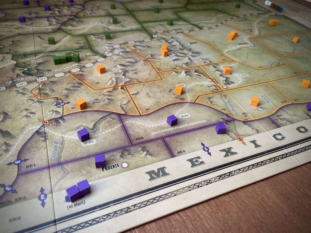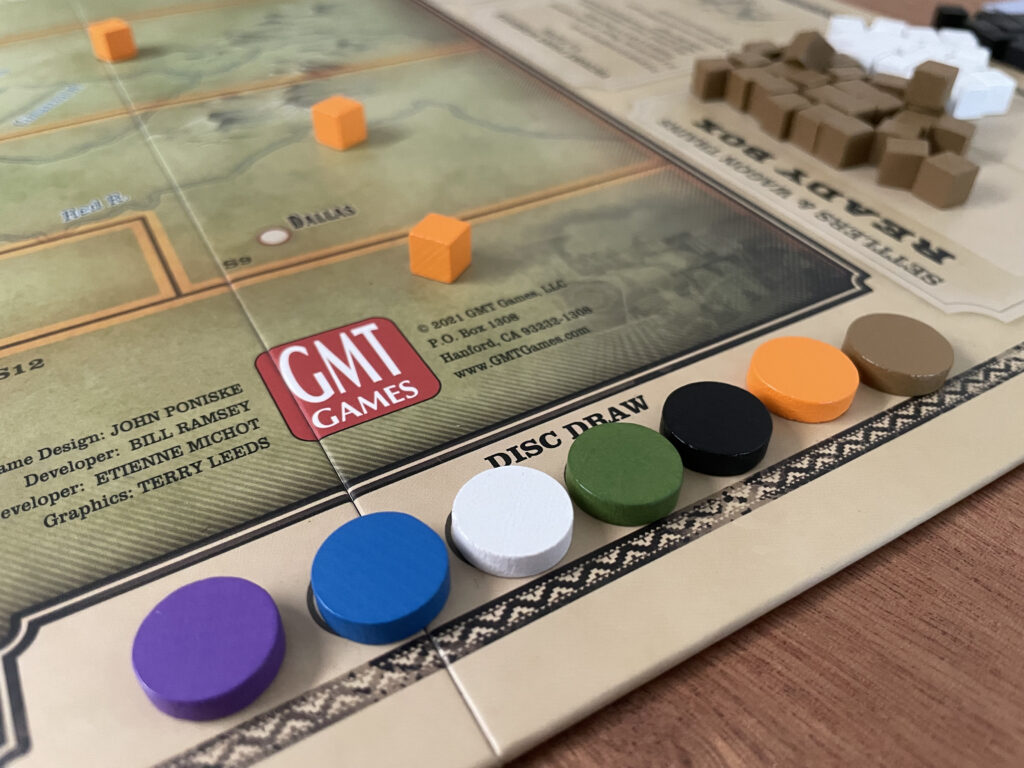 The game plays out on a large board with various regions of different colours, and cubes on them, denoting control (and, with the cubes, population) at the start of the game. The Northern Plains Tribes (green) Southern Plains Tribes (orange) who are politically neutral to each other, but resistant to the other enemy Indian tribes (purple) who nudge at the edge of the map, potentially looking to expand. These enemies work in tandem with three other factions: the Cavalry (blue) Settlers (brown) and attendant Wagons (white) making their way west, to the rockies. In a two-player game, one side acts for all the Plains Indians and the other the various opposed forces. With more players, these various factions are split amongst them. Essentially, it’s a battle for control: faction turns are decided randomly each round, with coloured discs drawn from a bag and that faction activating. Some are almost automated: Wagons always move west, and never start fights. Enemy tribes always add a single cube to their home territory, and then may move (which may result in a fight). For the four larger factions, there’s a little more to consider.