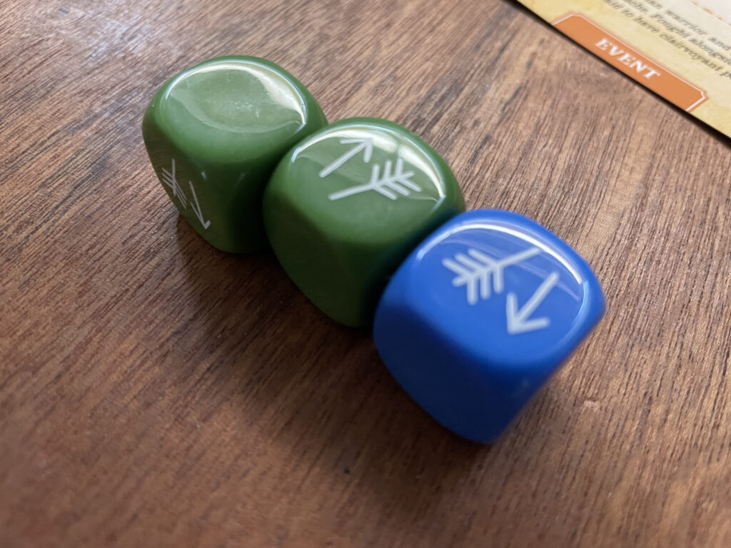 Basically each faction (except Wagons, who never start a fight) has a bespoke set of dice that are rolled, resulting in potential casualties for either side, the possibility of retreats, and even occasionally treaties that halt the battle and push the weaker force out of the territory. After you’ve added cubes, moved and fought, the next disc is drawn from the bag and that faction will now activate. But before we move on, it’s worth mentioning the four main factions also have Event cards they can play (optionally) on their turn as well.