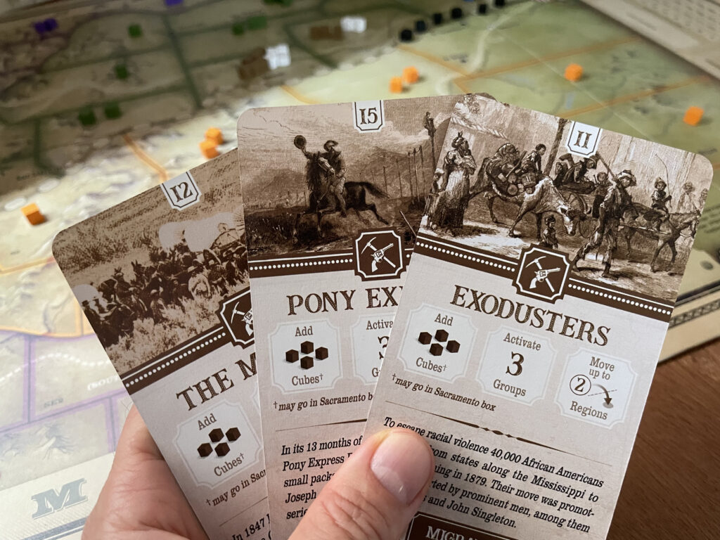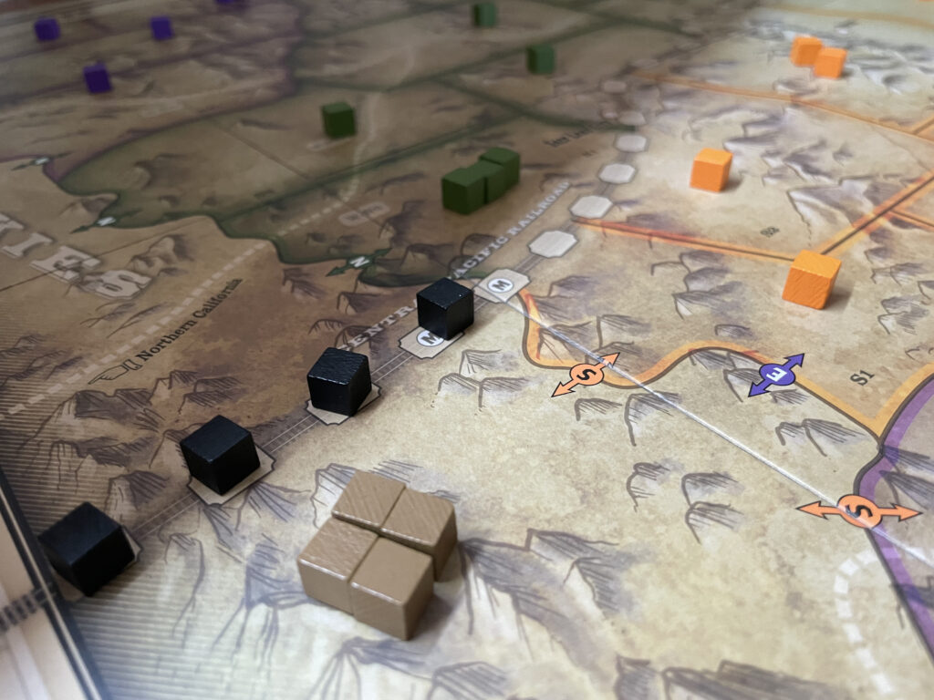 There’s another disc in the bag we’ve not mentioned yet, with its attendant supply of black cubes. Whenever the black Transcontinental Railroad disc is drawn, the construction of the railroad advances from both east and west (using the black cubes), as long as there are settlers in the region in question to supply the workforce. The railroad isn’t just a thematic ornamentation, however: it’s presence defines both the advance and success of the newcomers, and functions as a game clock: when it’s finished, the game ends (the game can also end when someone runs out of cards).