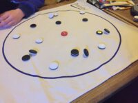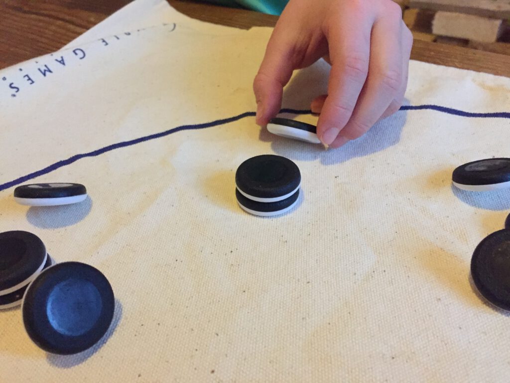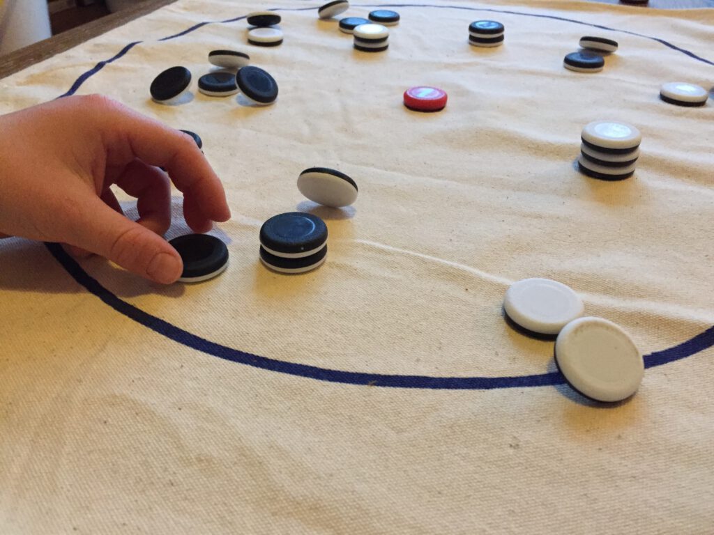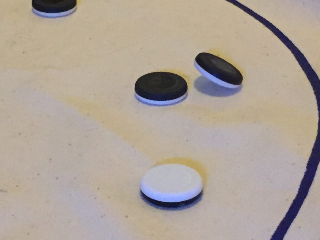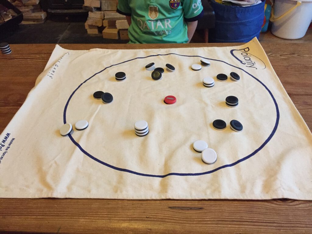 Each player takes possession of a set of magnets with one player playing the white side and one the black. The board is actually a mat that you roll out – it doesn’t need to be uber-flat so the odd wrinkle is fine. Each player places five foundation magnets on the board and a red magnet at the centre.