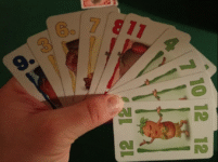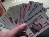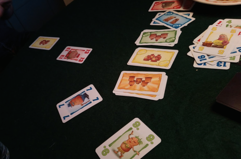 Players are dealt the whole deck, barring a few cards – which means nobody is 100% sure which cards are missing. Scoring cards – sacks of potatoes – go in the centre of the table. As with the deck itself the scoring cards are of the four colours; plus an extra ‘golden’ scoring card.