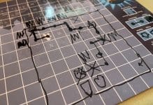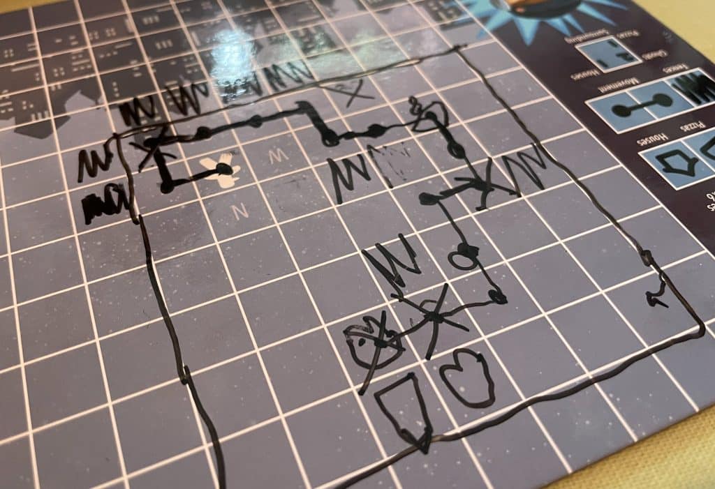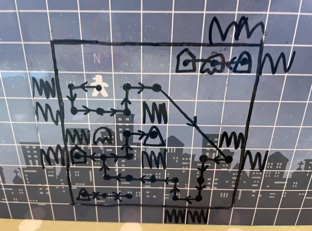 Before the game begins the mayor will construct a town behind a screen, then give each player a different starting point in the town. The players each have a grid on a laminated board and will construct the map of the town as they feel their way around: on each turn they have three options: move, attack, or use a psychic power. When they try and move – always one space orthogonally on the grid – the mayor will tell them if they are successful (ie that direction isn’t blocked) and what now surrounds them in their new location – but not precisely where these things are. For example, you might be told you’re adjacent to a ghost and a house. Ghosts can be attacked to get them out of the way, and successfully doing so awards you a psychic power card that can be played as a one-off special ability.