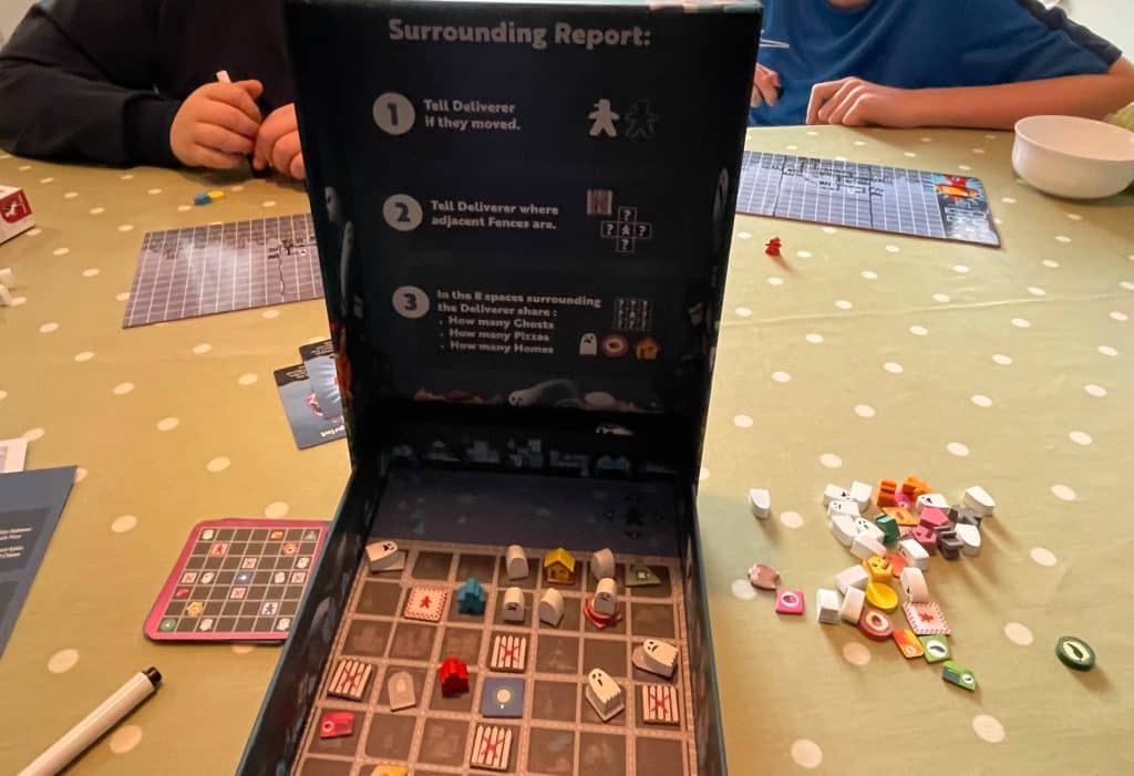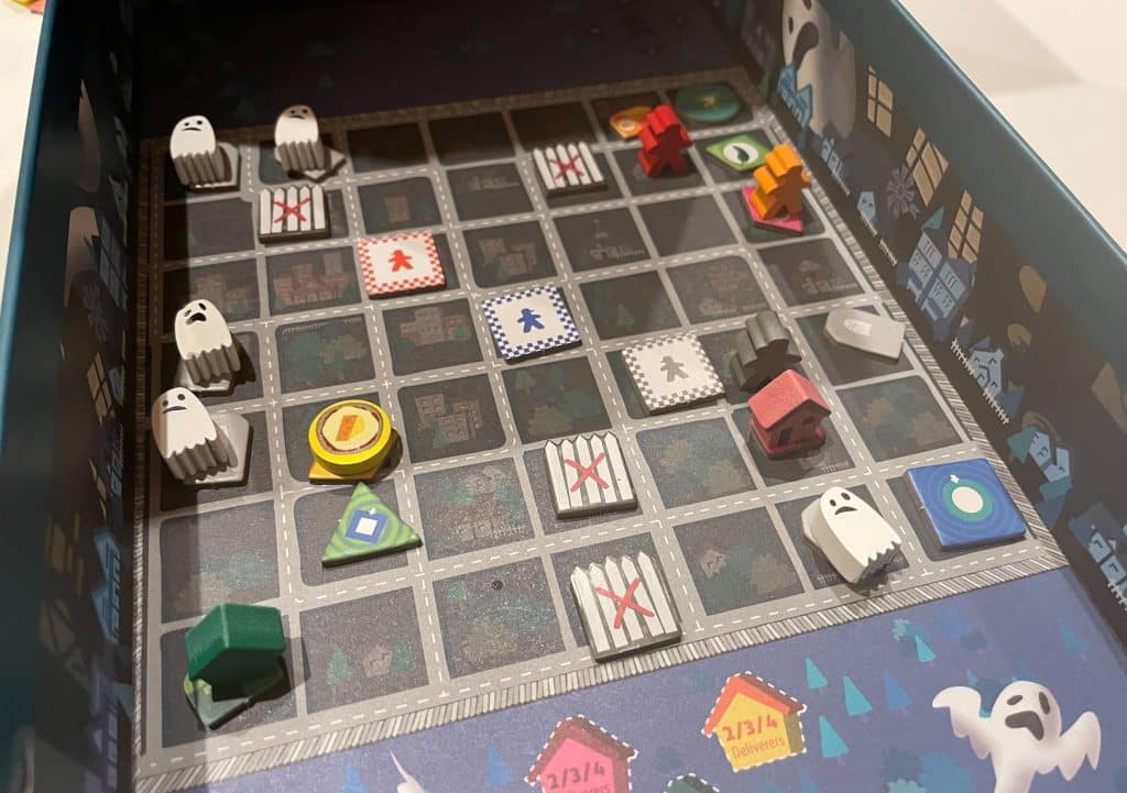 Your goal as one of the Psychic Pizza Deliverers is to first find a pizza, and then deliver it, and each pizza has to go to a specific house. As the game continues, players may start to see where their individual maps overlap, giving everyone a bigger picture of the ghost town as you combine knowledge. What’s in your way – as well as ghosts – are warp spaces that ping you to somewhere new, and the fact you’re basically stumbling around in the dark. The players have 20 turns to successfully deliver a pizza, and the first person to do so wins the game. If nobody manages to do so, the mayor wins!