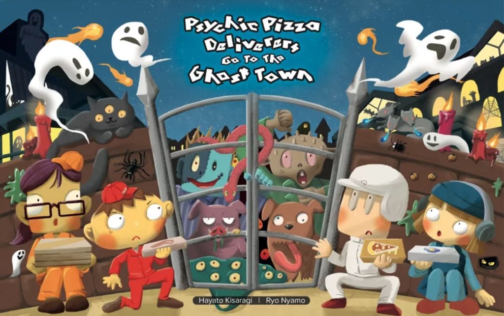 In Psychic Pizza Deliverers Go To The Ghost Town, everyone is trying to be the first to deliver their pizzas – everyone but one player, who takes the role of ‘mayor’. The mayor decides on the geography of the ghost town, and guides the players through it, the catch being that these delivery folk cannot see where they are going. It’s that kinda place.