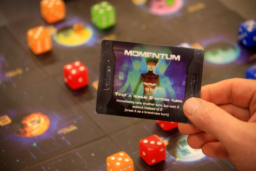 The other elements are the ships special powers – each numbered ship has a special ability it can use once per turn – and two decks of technology cards which can be used to ‘power up’ and give you extra abilities – either as a one-off action, or once per turn. These aspects to the game can make it really hard to predict what players will do at times, and combat serves a double purpose – as well as disrupting your opponents plans, winning enough battles can also allow you to place a quantum cube on the board without having your ships adjacent to it – a potentially game-winning move.