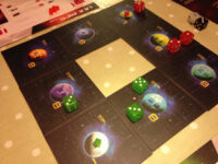 Your goal – to place all of your quantum cubes before anyone else does. To do that, the value of your spaceships (represented by dice) must equal the number value of a given planet they’re adjacent to – but while you’re trying to manoever your ships into place, your opponents will be doing all they can to stop you.