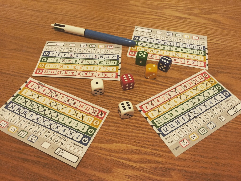 Each player takes a score sheet, and attempts to cross off as many numbers as possible on four different coloured rows, red and yellow numbered 2-12, green and blue numbered 12-2, using numbers available on the coloured dice. The catch is that once you’ve checked off a number you lock out all those before it.Thus your options diminish over the course of the game, and you find yourself rolling ‘fehlwurfe’, or mis-throws, which score -5 points. Once players have locked out two of the coloured rows, or someone has made four mis-throws, the game is over and scores are tallied. The more crosses per row, the more points.