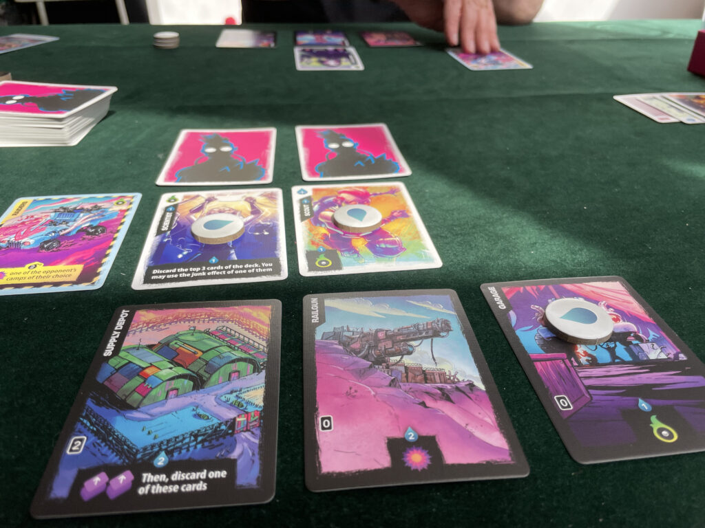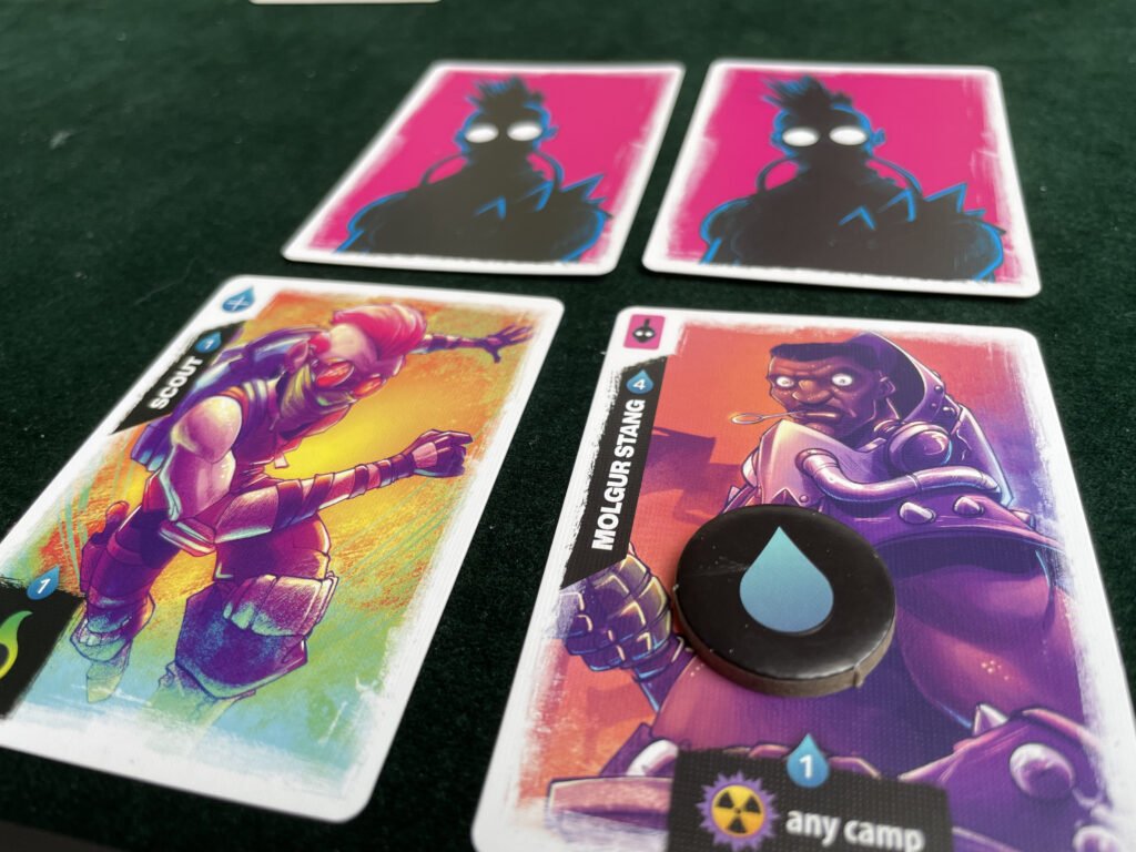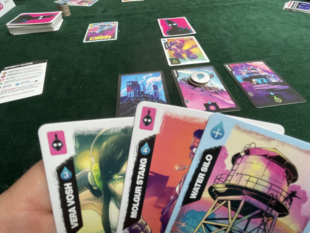 Almost everything in Radlands costs water, and fortunately you get three water tokens at the start of each turn. You can spend them to play a people card above a base, activate a previously-played card, activate a base, or draw more cards from the deck. You can also simply junk a card to gain a reward: it might be water, damage, repairs, or punks. Punks are the normal cards but played face-down: each base is protected by the cards you play in front of it (a maximum of two to each base) so much of the game is about trying to keep these columns filled with people you can then activate. Punks don’t have any kind of activation, but they do present a modest barrier: most cards take two damage to kill them off (ie remove them from play) but punks only take one: they’re removed the moment they get hit.